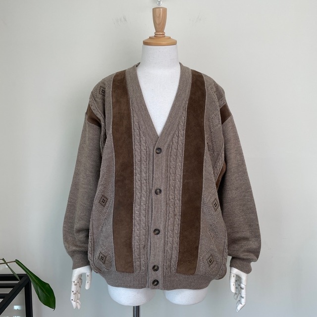 80s 90s イタリア製 NORM THOMPSON スエード切り替えカーディガン ヴィンテージ 古着 ニット 茶 ブラウン ケーブル編み ウール 80年代 90年代 ビンテージ L 25112311