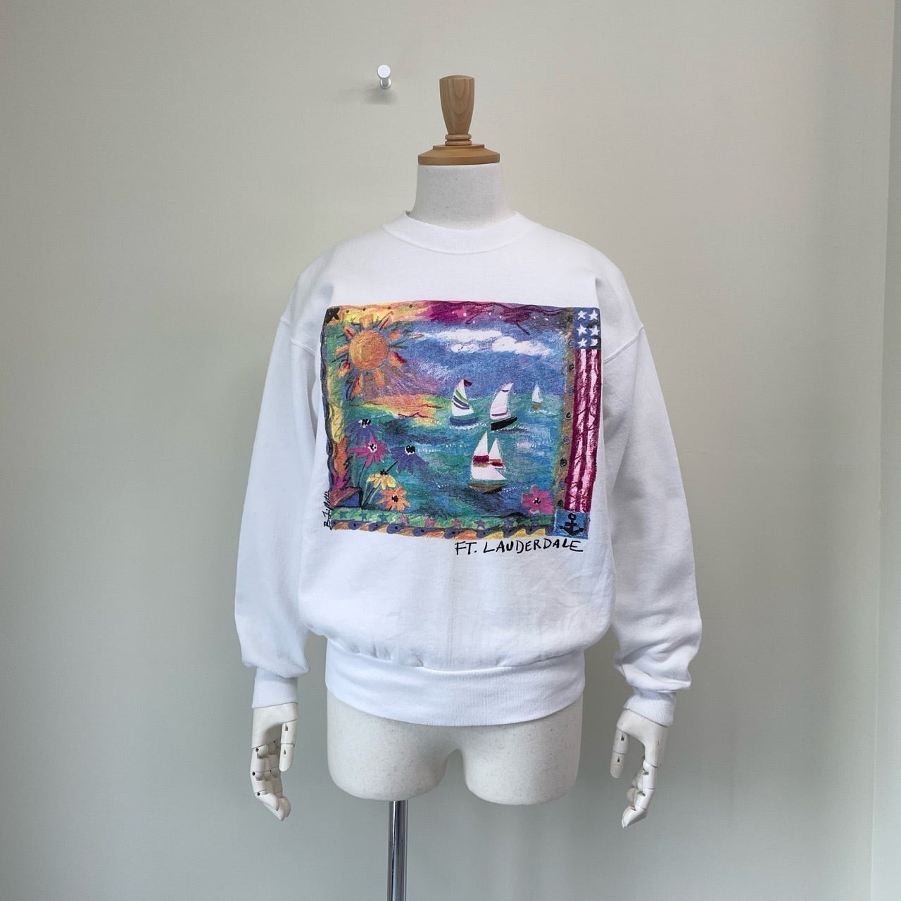 90s USA製 FT.LAUDERDALE アート スウェット 古着 ヴィンテージ 白 ホワイト 海 ヨット 絵画 プリント トレーナー 90年代 ビンテージ 25040611