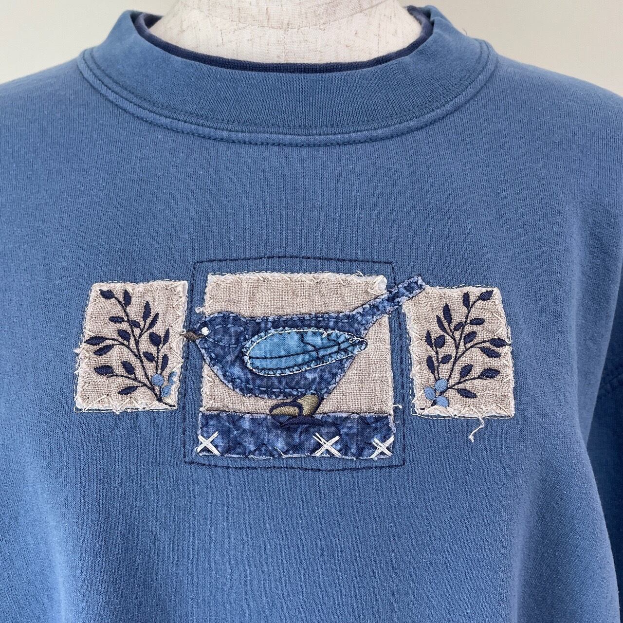 古着 鳥 スウェット レディース 古着 レトロ カントリー ヴィンテージ 青 ブルー 水色 レイヤードネック 動物 アニマル ビンテージ 25050603