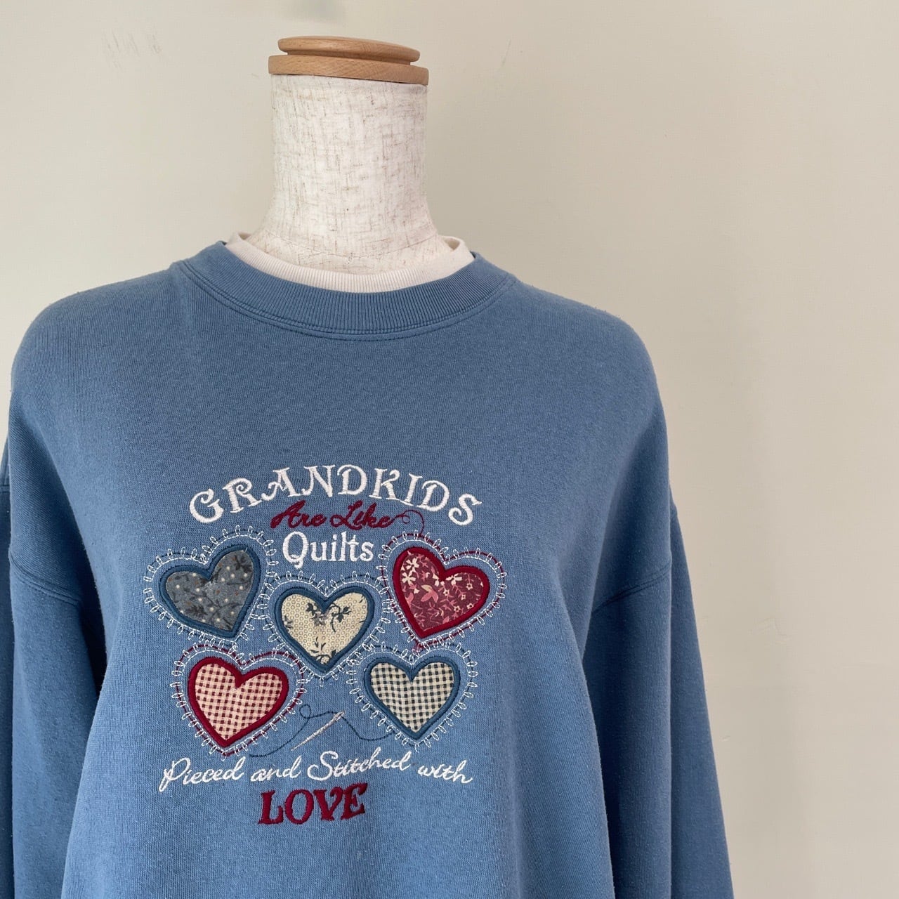 古着 ハート 刺繍 スウェット レトロ レディース ヴィンテージ 水色 ライトブルー レイヤードネック ビンテージ カントリー 25050604