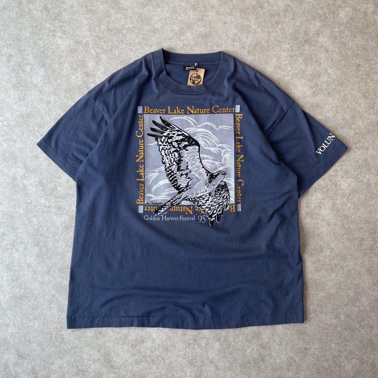 90s USA製 鷹 アート アニマルTシャツ ヴィンテージ 古着 鳥 動物 1995年 ブルーグレー 90年代 ビンテージ シングルステッチ 25071403