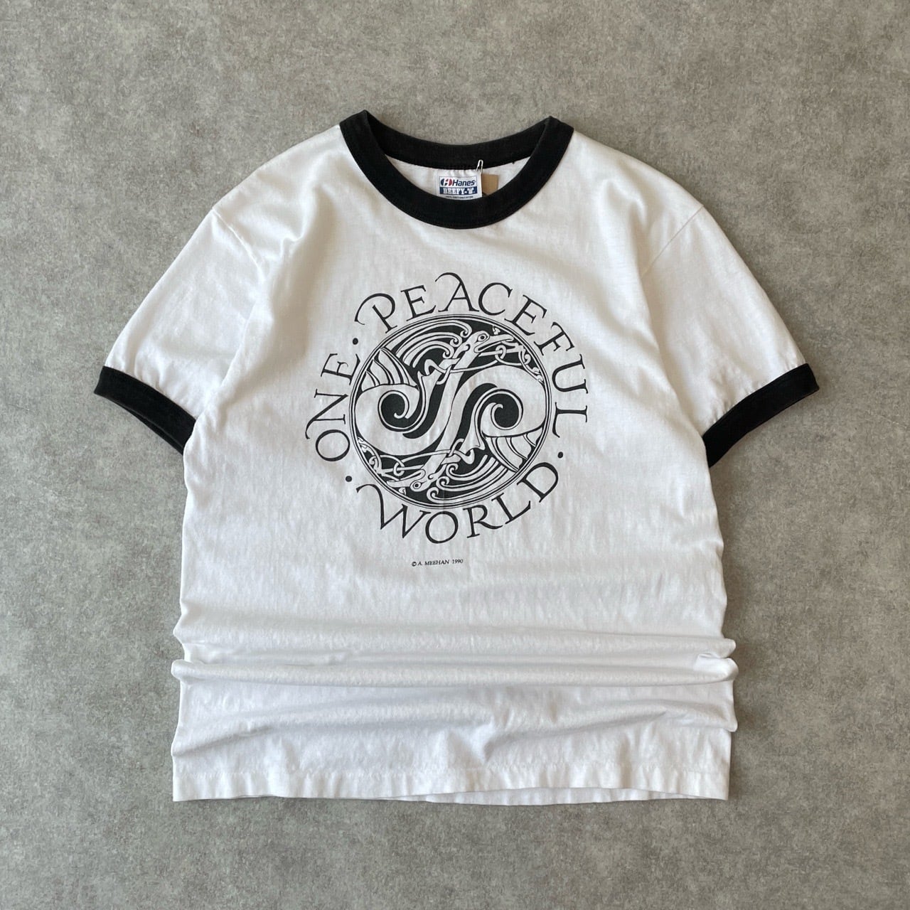 90s USA製 ONE PEACEFUL WORLD リンガーTシャツ ヴィンテージ 古着 ロゴ アート 白 ホワイト 黒 ブラック シングルステッチ 90年代 ビンテージ 25071802
