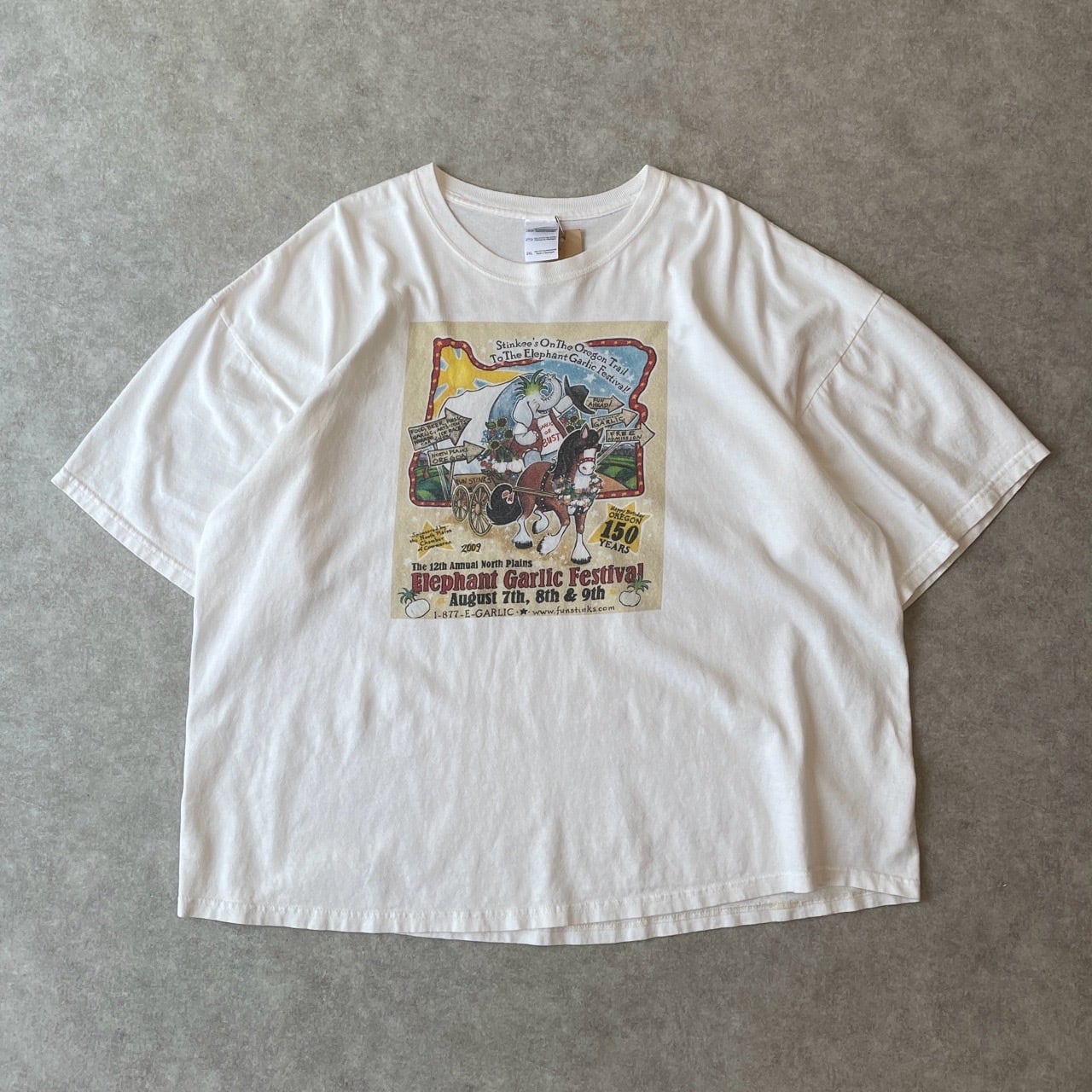 00s Elephant Garlic Festival 象 馬 アートTシャツ ヴィンテージ 古着 企業ロゴ アニマルTシャツ 動物 2009年 白 ホワイト ビンテージ Y2K 00年代 2000s 2000年代 コットン 2XL 25080202