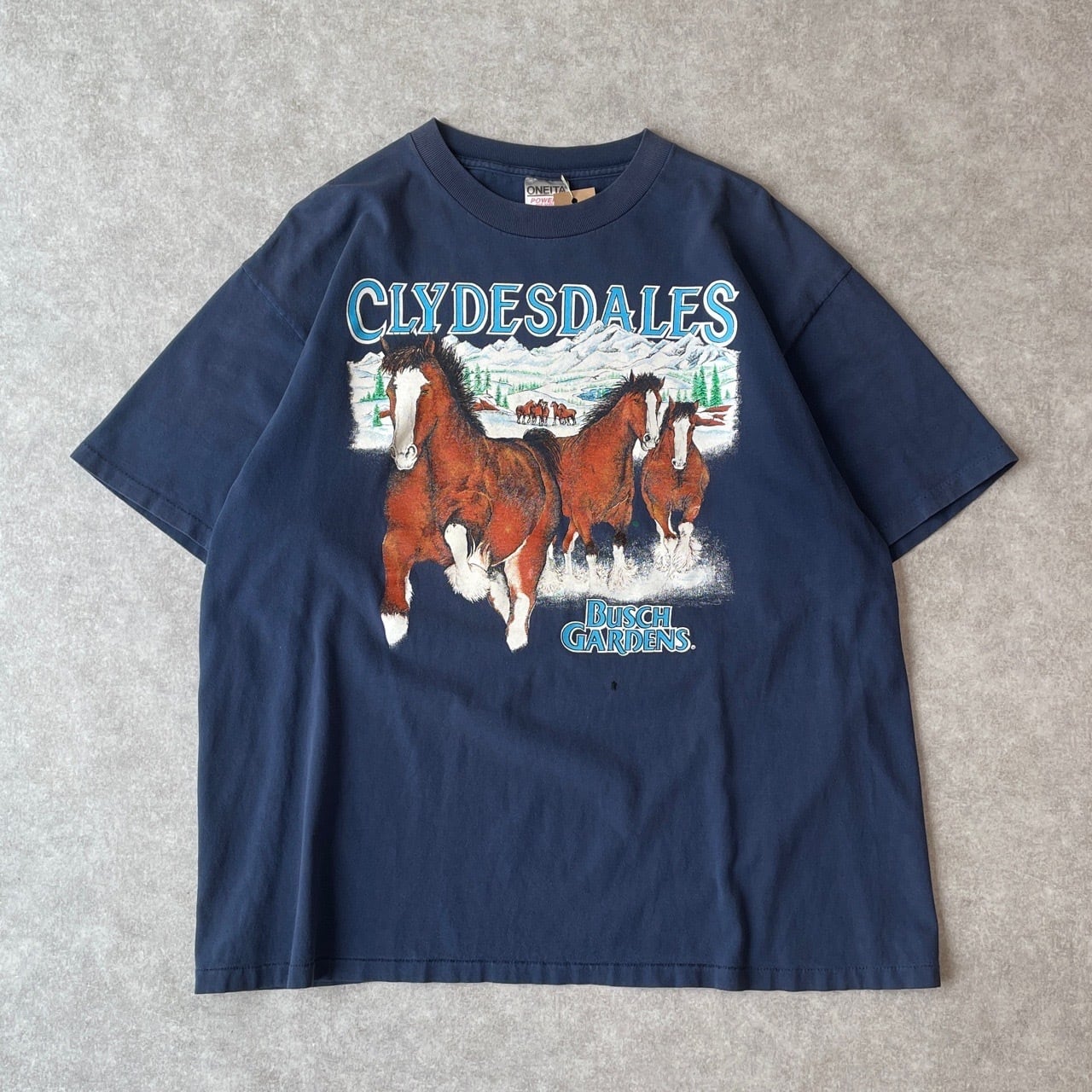 90s USA製 CLYDESDALES 馬 アニマルTシャツ ヴィンテージ 古着 アート 動物 クライズデール 紺 ネイビー シングルステッチ コットン 90年代 ビンテージ XL 25080409