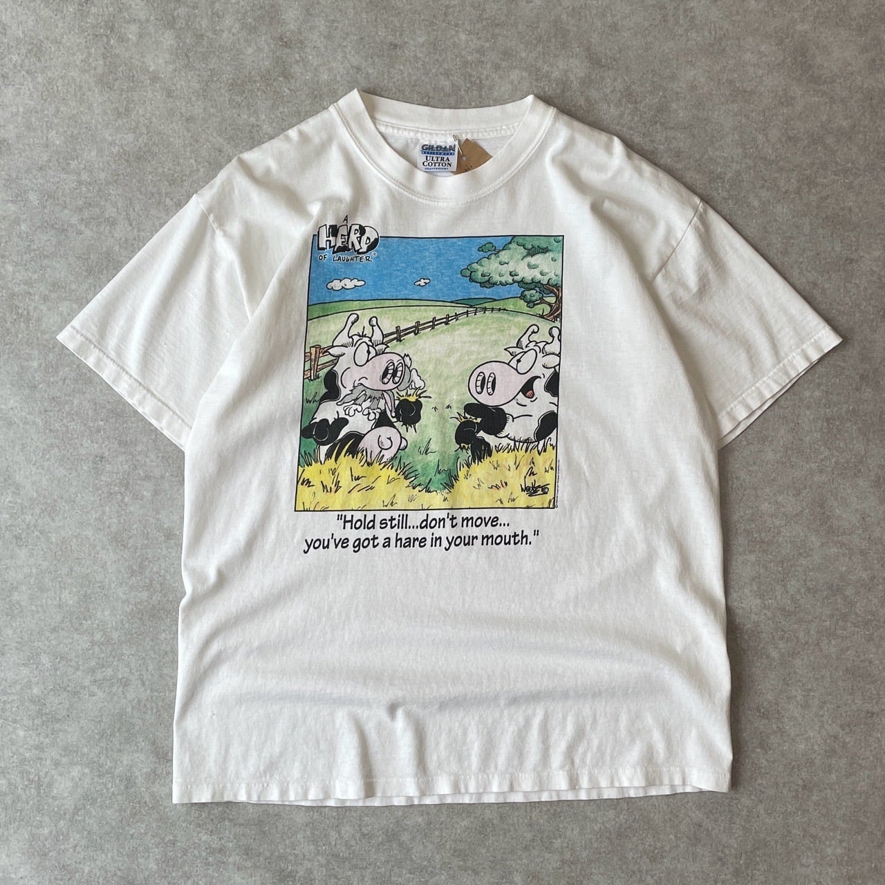 90s 牛 アート カートゥーン アニマルTシャツ ヴィンテージ 古着 動物 A HERD OF LAUGHTER コミック イラスト 白 ホワイト 90年代 ビンテージ L 25081015