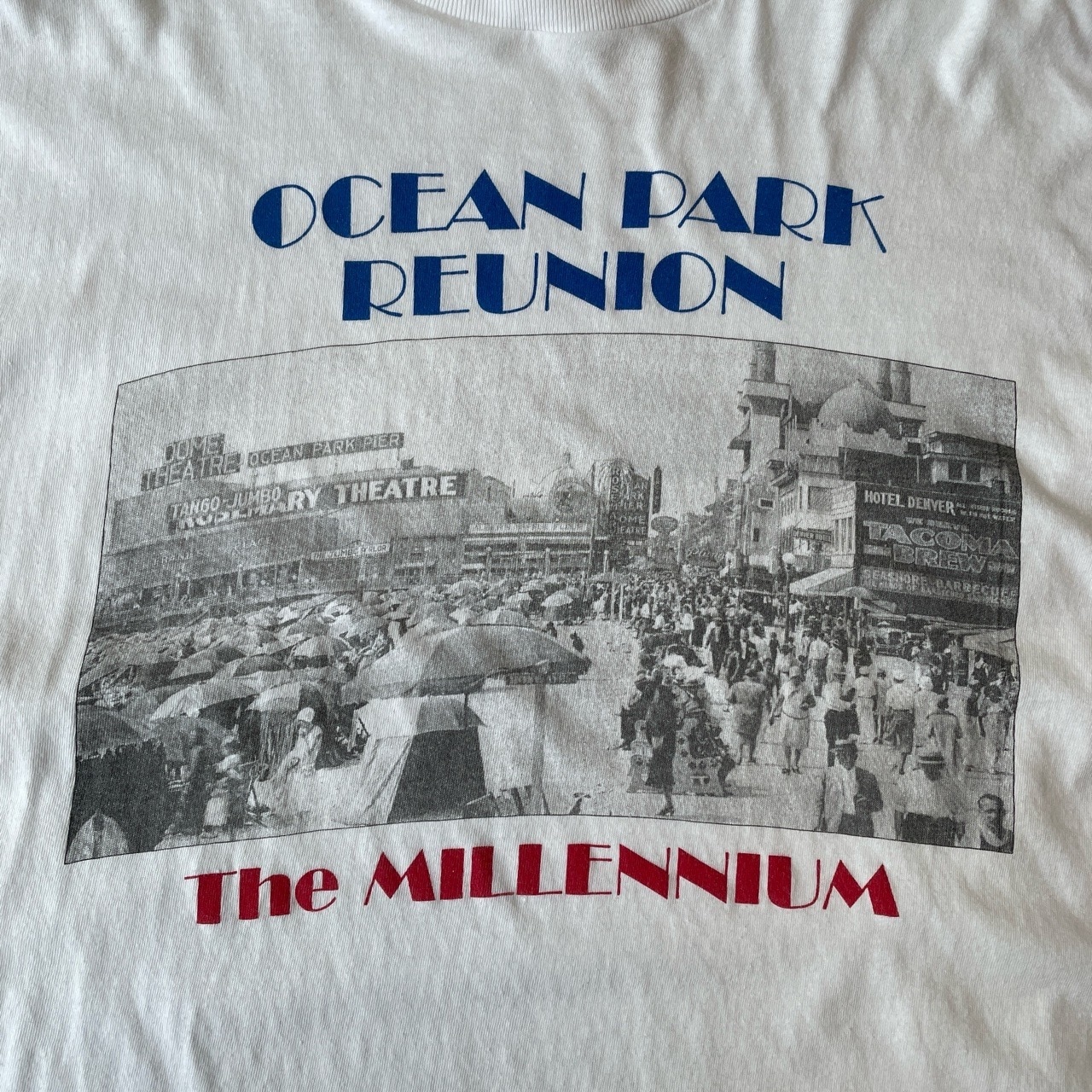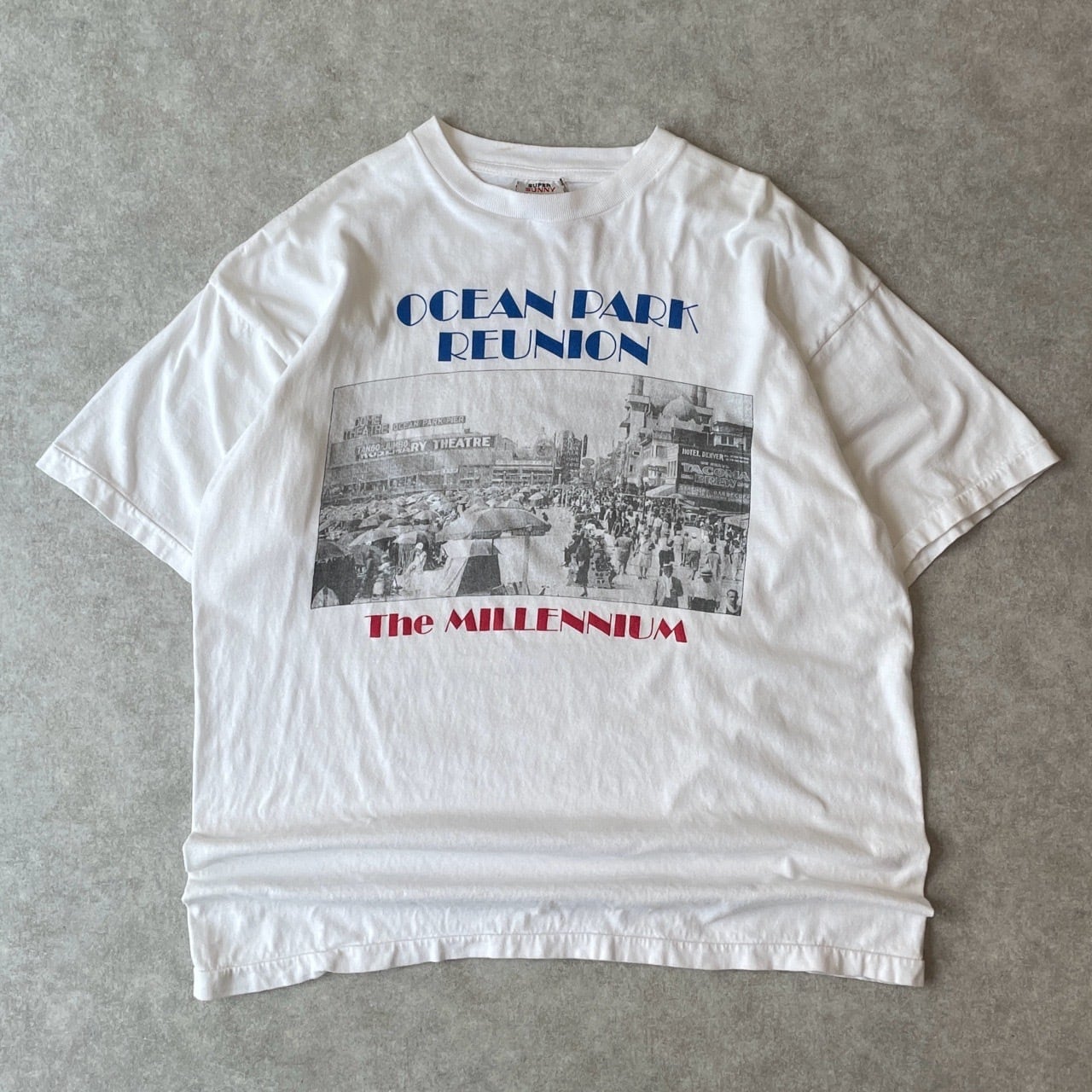 90s サンタモニカ オーシャンパーク フォトプリントTシャツ ヴィンテージ 古着 白 ホワイト 遊園地 オールドフォト 写真 風景 街並み アメリカ シングルステッチ 90年代 ビンテージ XL 25081704