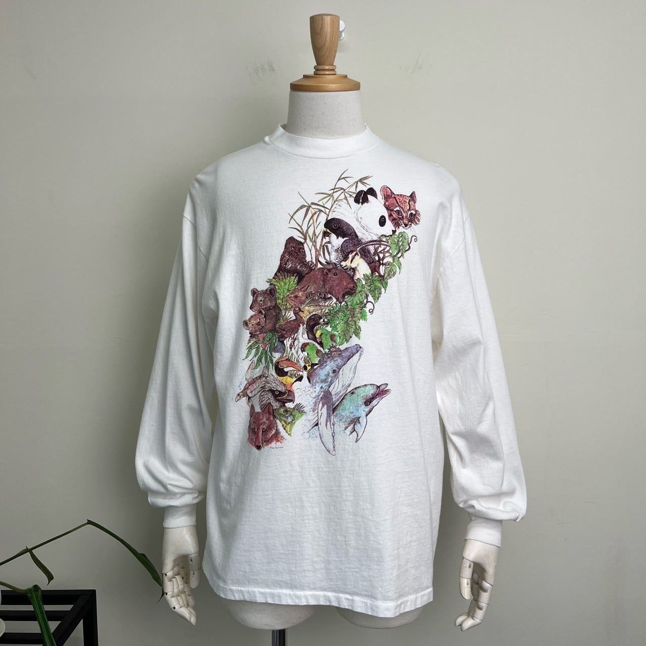 90s アニマル 動物 アート 長袖Tシャツ ロンT ヴィンテージ 古着 チーター パンダ ゴリラ コアラ クジラ イルカ キツネ 亀 鳥 白 ホワイト 90年代 シングルステッチ ビンテージ L 25102008