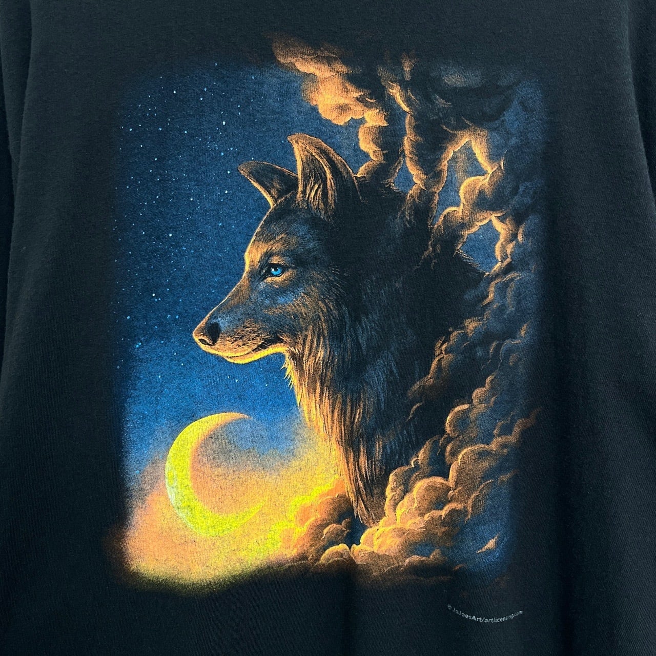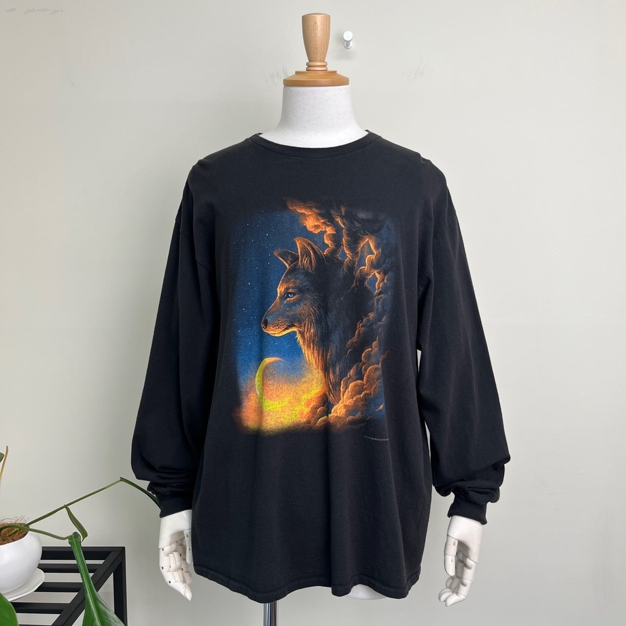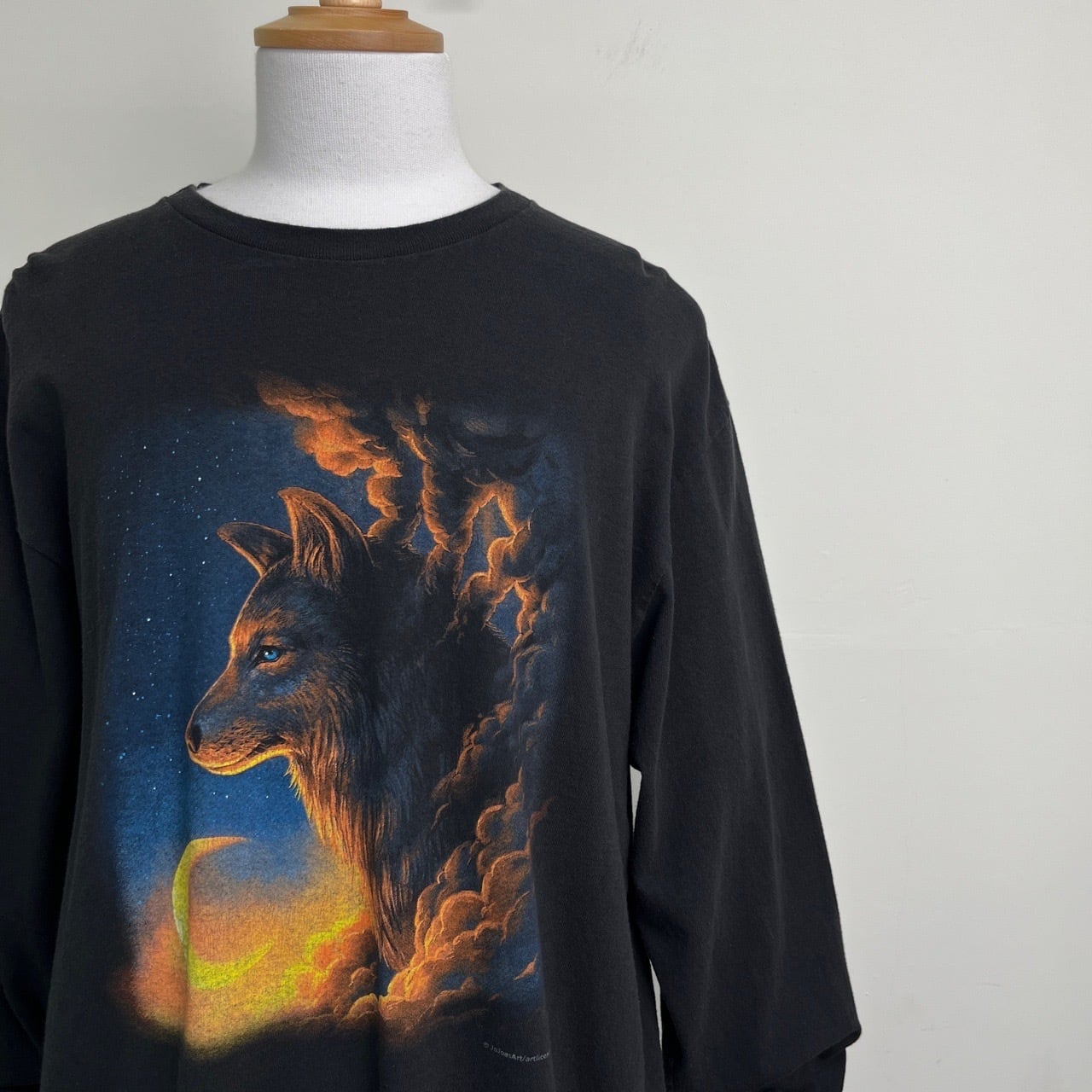 古着 オオカミ ウルフ アニマル アート 長袖Tシャツ ロンT ヴィンテージ 黒 ブラック 狼 動物 00s Y2K ビンテージ XL 25102009