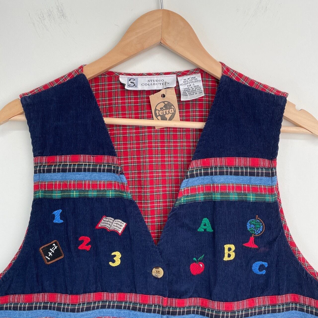 80s 90s レトロ 刺繍 パッチワーク コーデュロイ ベスト ヴィンテージ 古着 学校 スクール カントリー 紺 ネイビー レディース ビンテージ 80年代 90年代 L 25110802