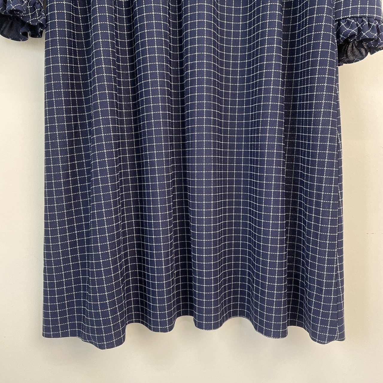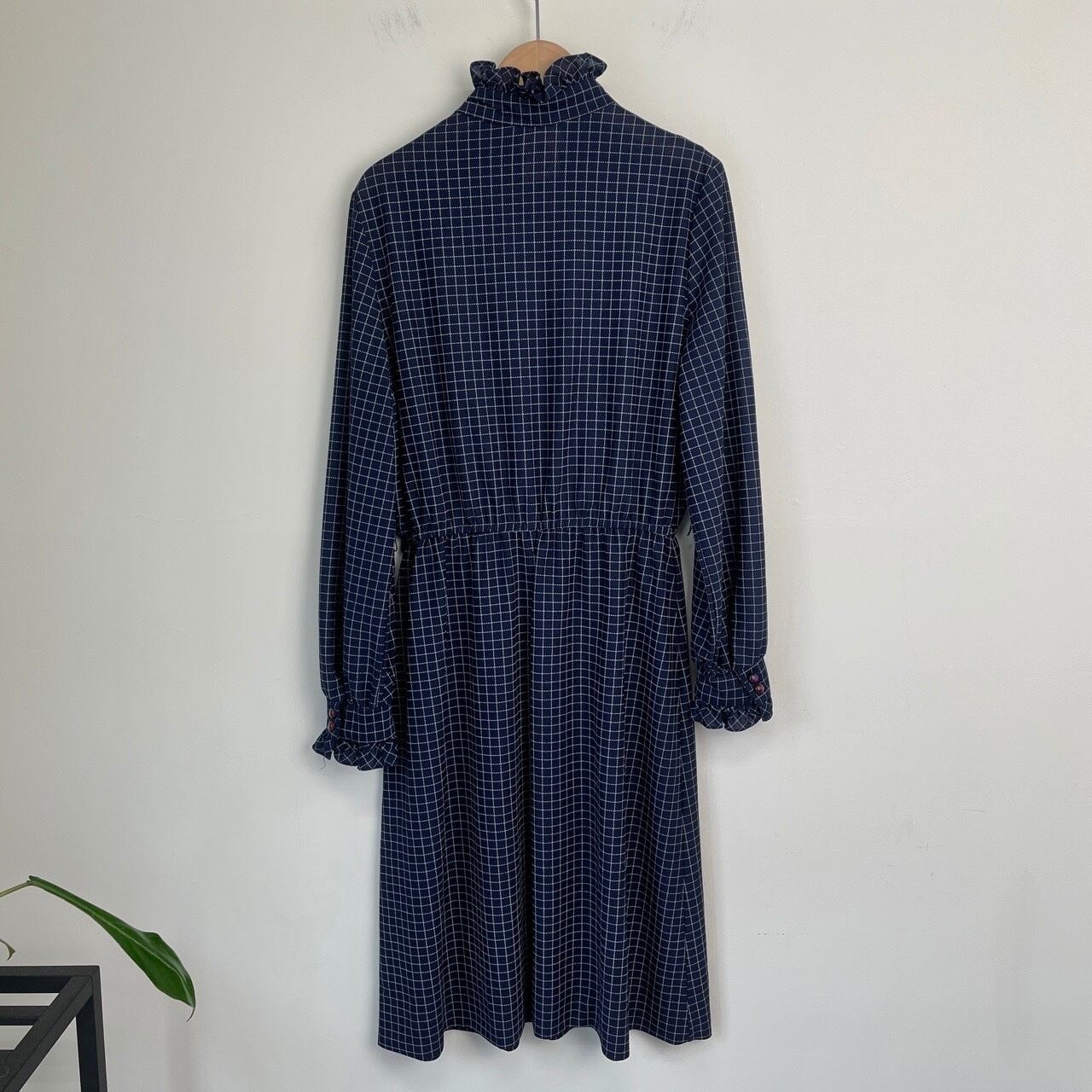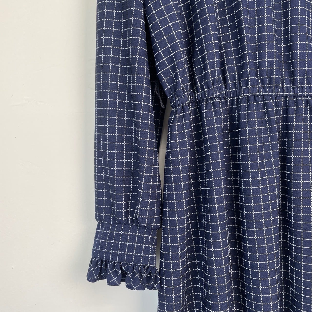 60s 70s チェック フリル シースルー ワンピース ヴィンテージ 古着 レトロ 紺 ネイビー レディース ガーリー 長袖 60年代 70年代 ビンテージ 25110803