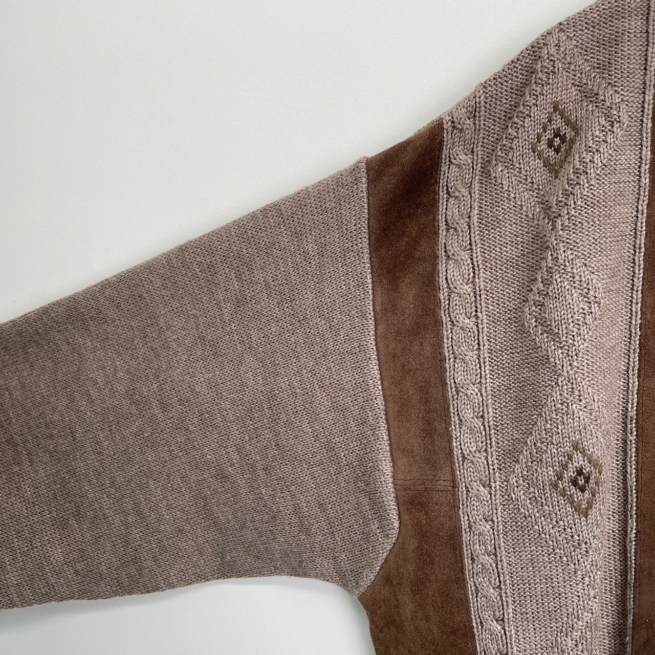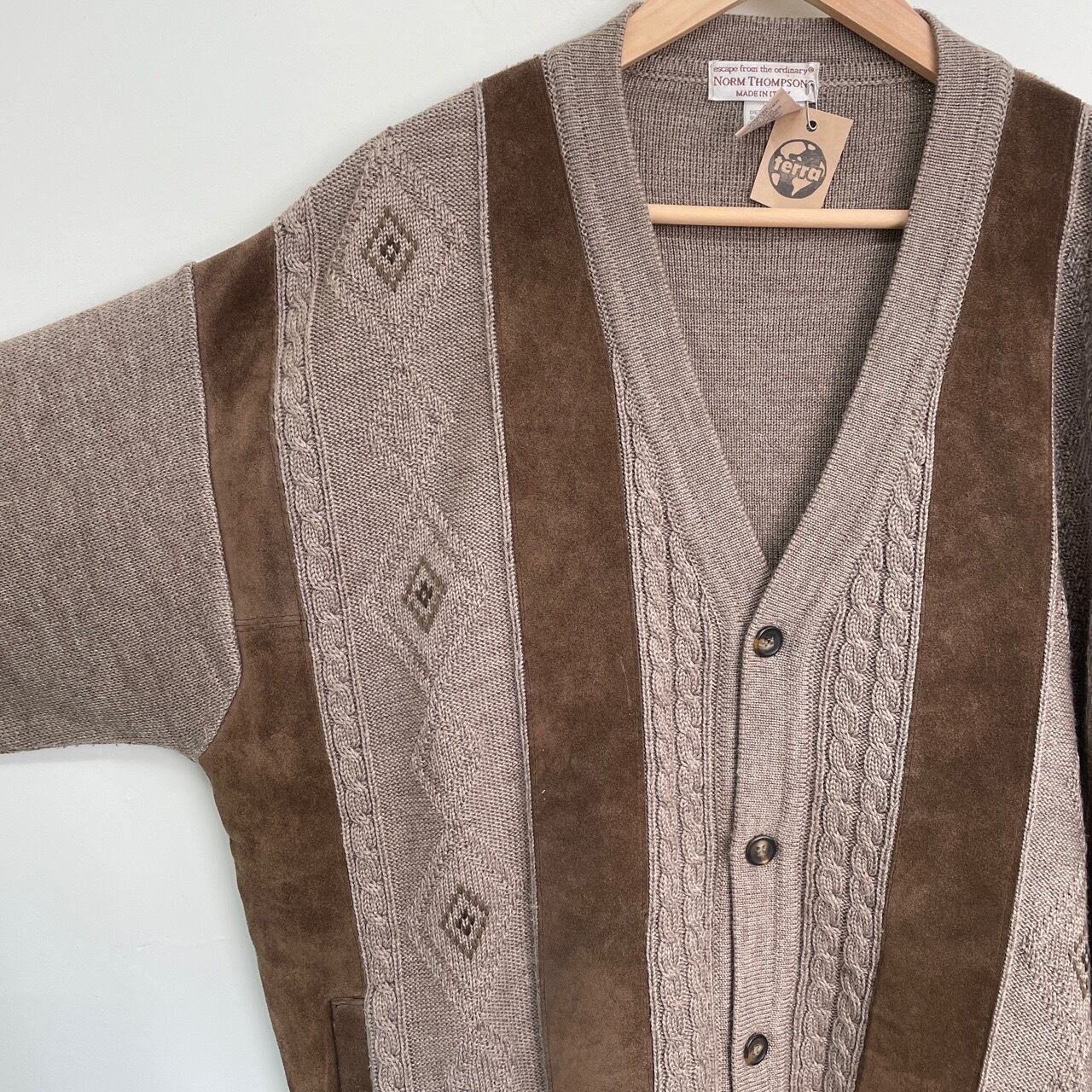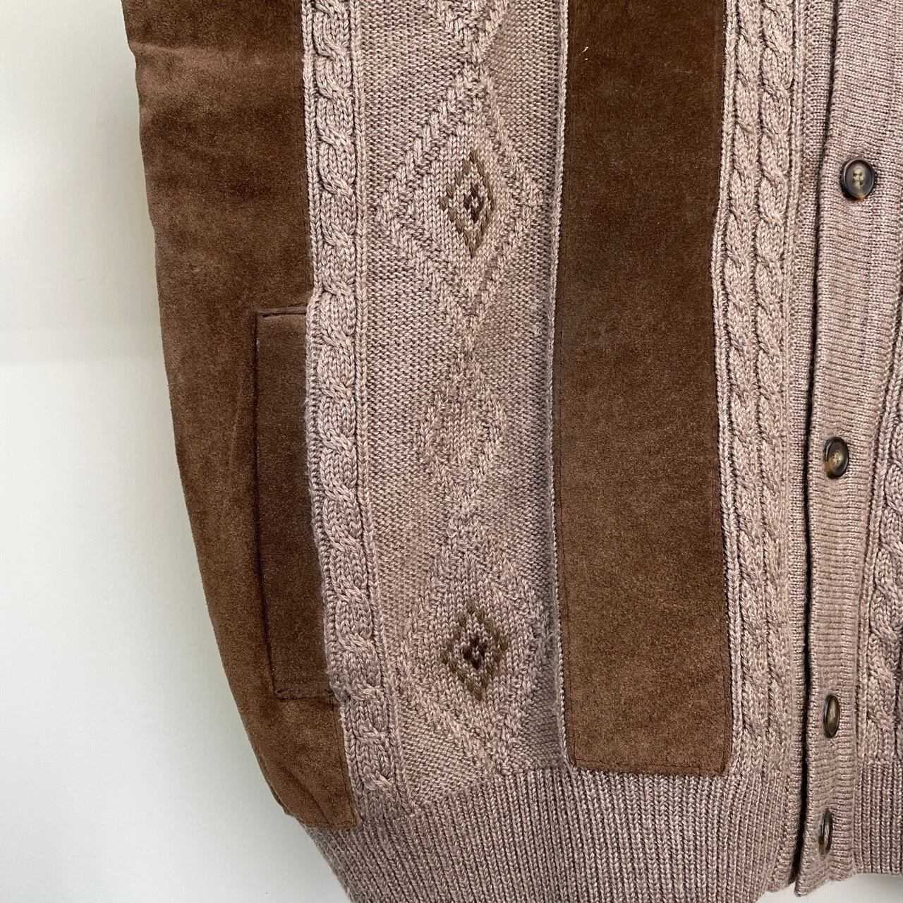 80s 90s イタリア製 NORM THOMPSON スエード切り替えカーディガン ヴィンテージ 古着 ニット 茶 ブラウン ケーブル編み ウール 80年代 90年代 ビンテージ L 25112311