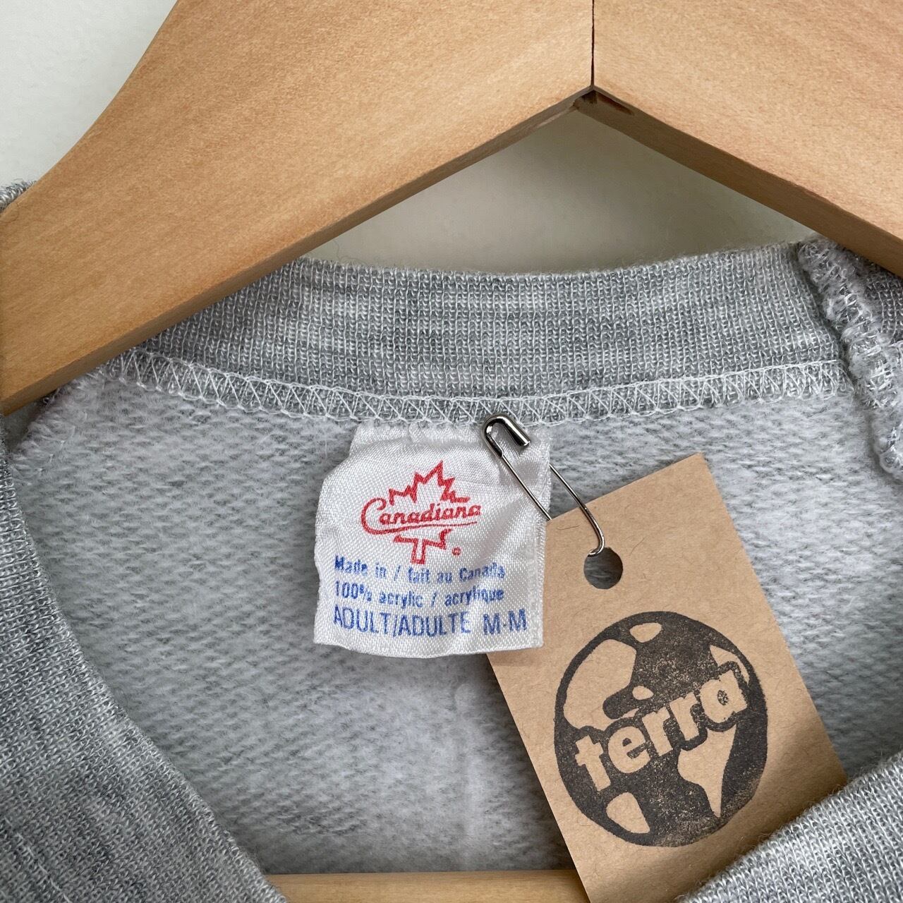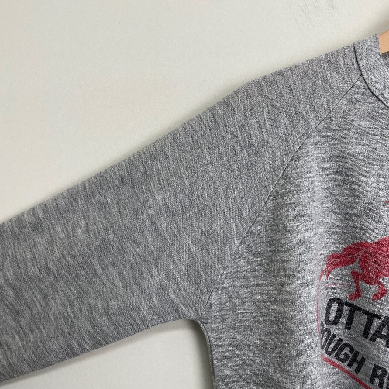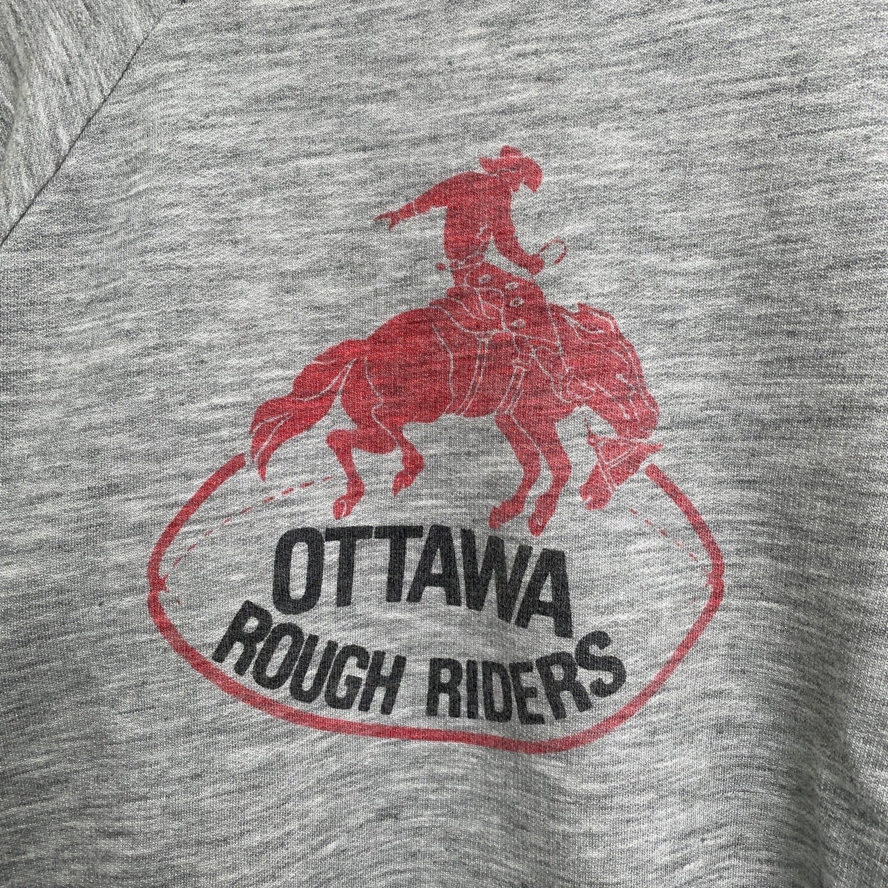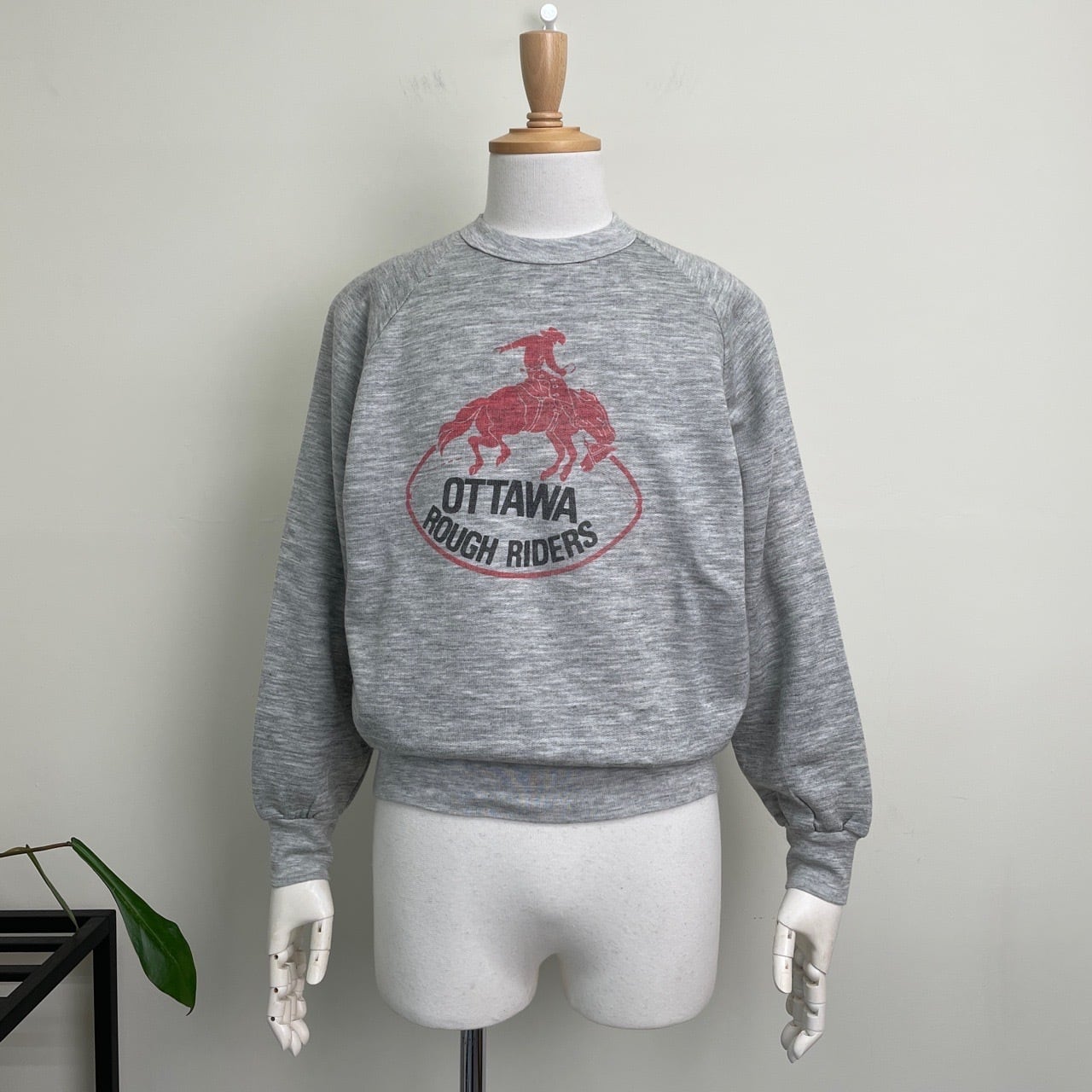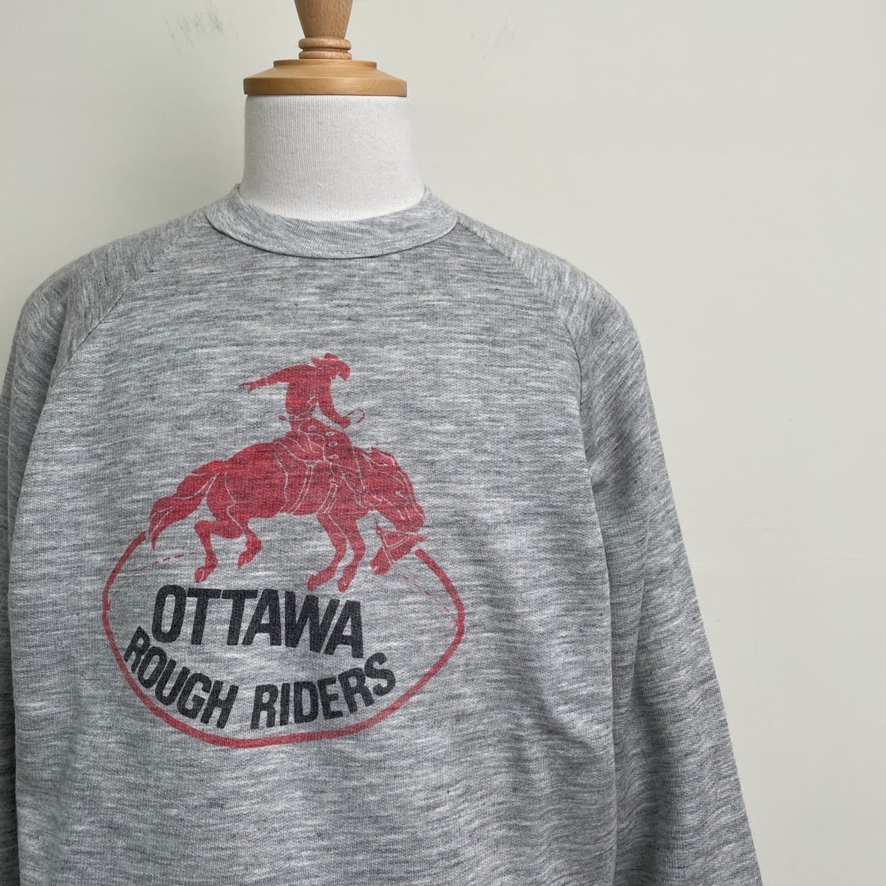 70s 80s カナダ製 OTTAWA ROUGH RIDERS 染み込みプリント スウェット ヴィンテージ 古着 霜降りグレー 杢 ラグラン 70年代 80年代 ビンテージ M 25112511