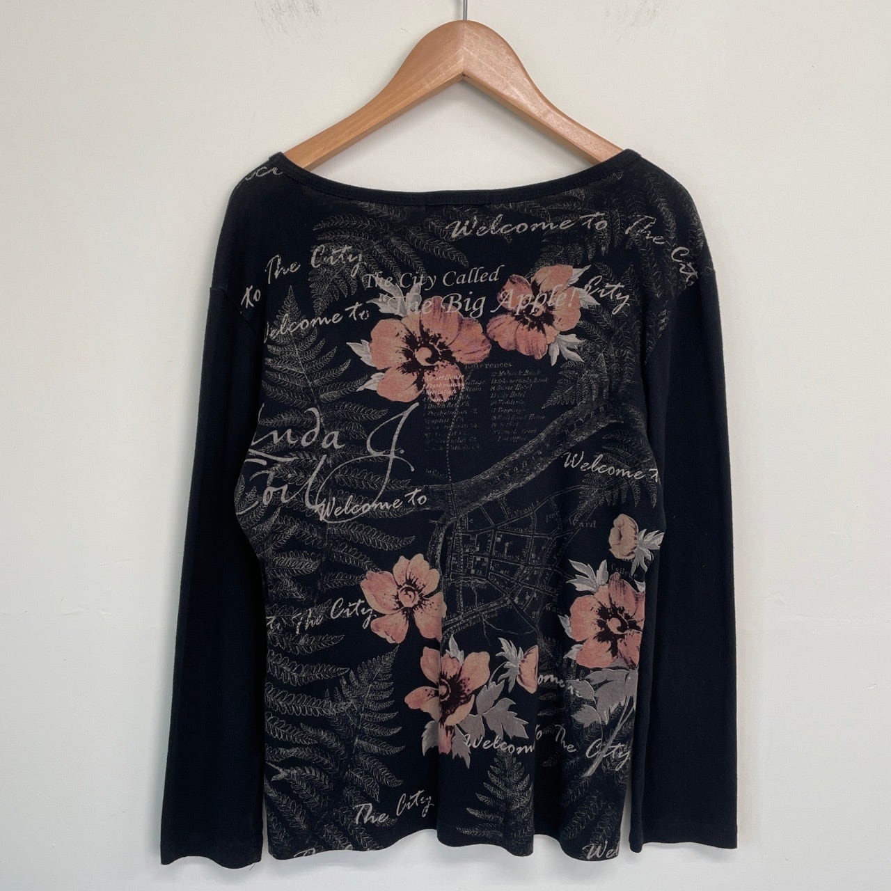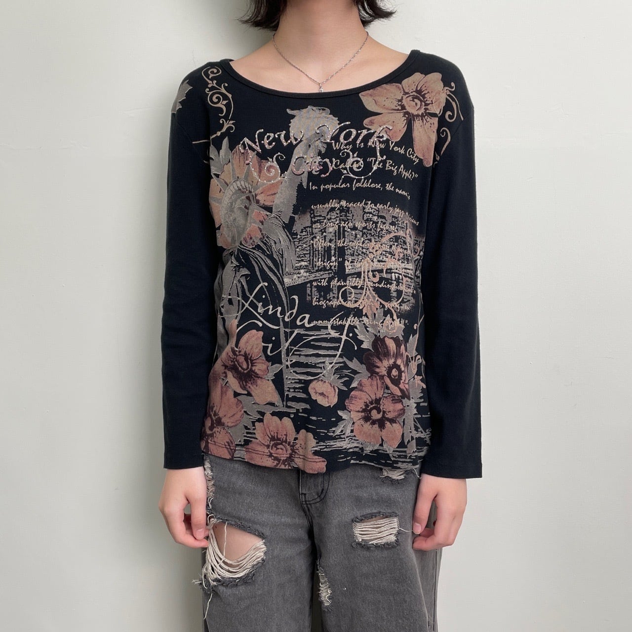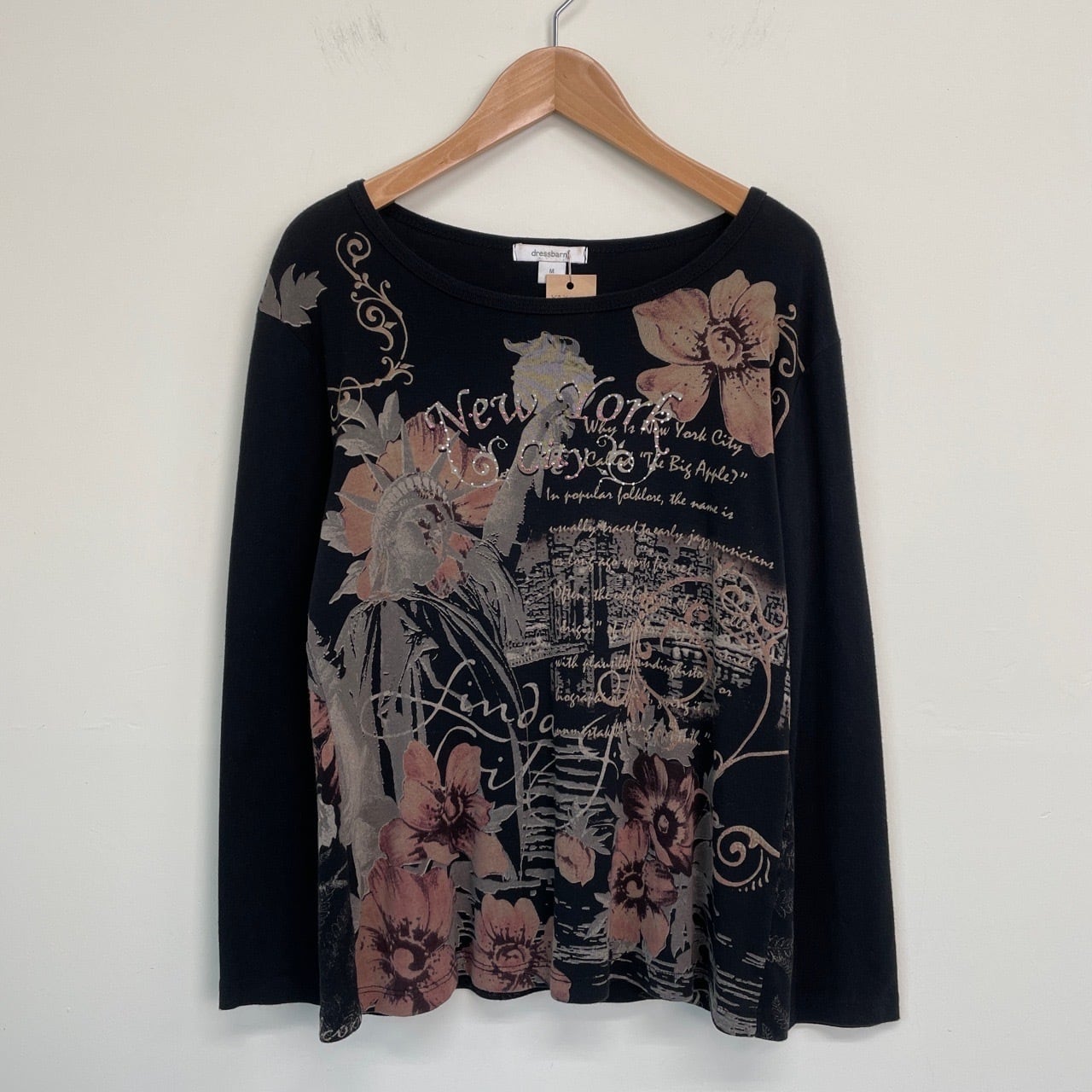 Y2K dressbarn レディース ロンT カットソー 長袖Tシャツ 黒 ブラック 花 自由の女神 New York ニューヨーク 00s アーカイブ USA製 M 25120409