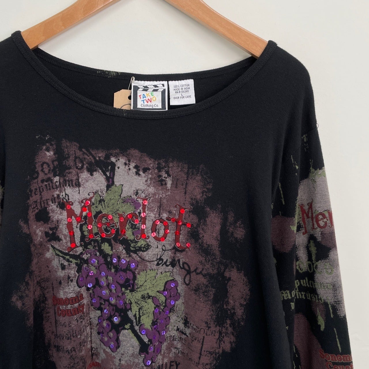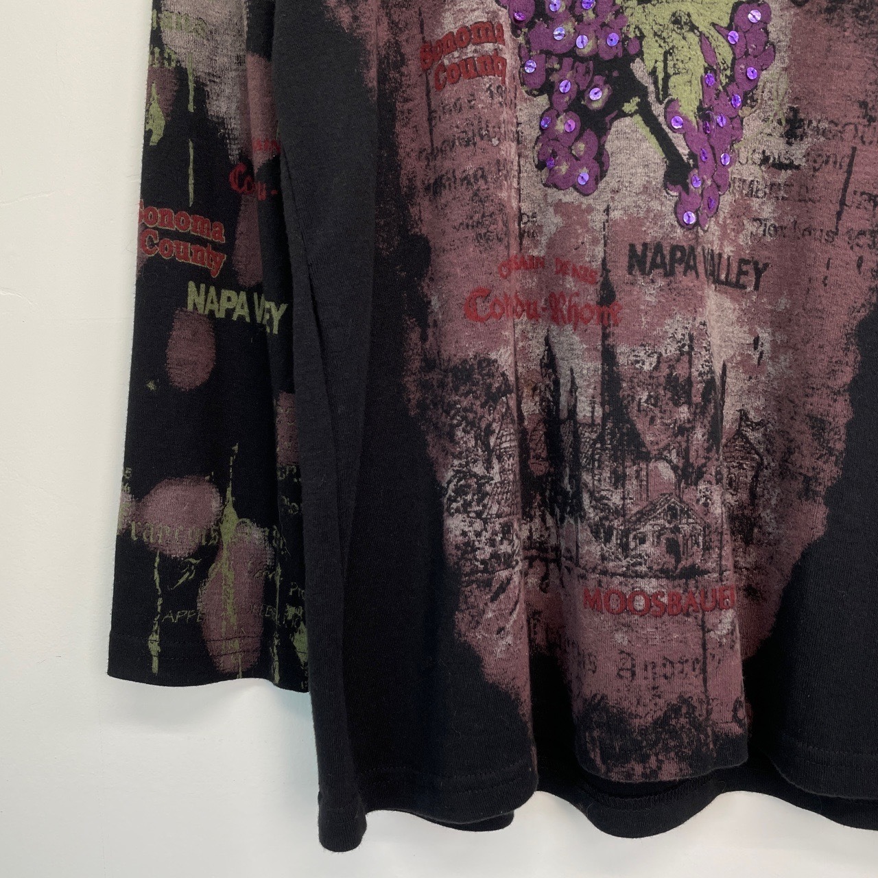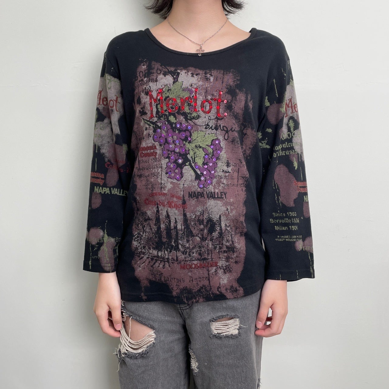 Y2K TAKE TWO レディース ロンT カットソー 長袖Tシャツ 黒 ブラック スパンコール ぶどう ブドウ パンク グランジ 00s アーカイブ L 25120410