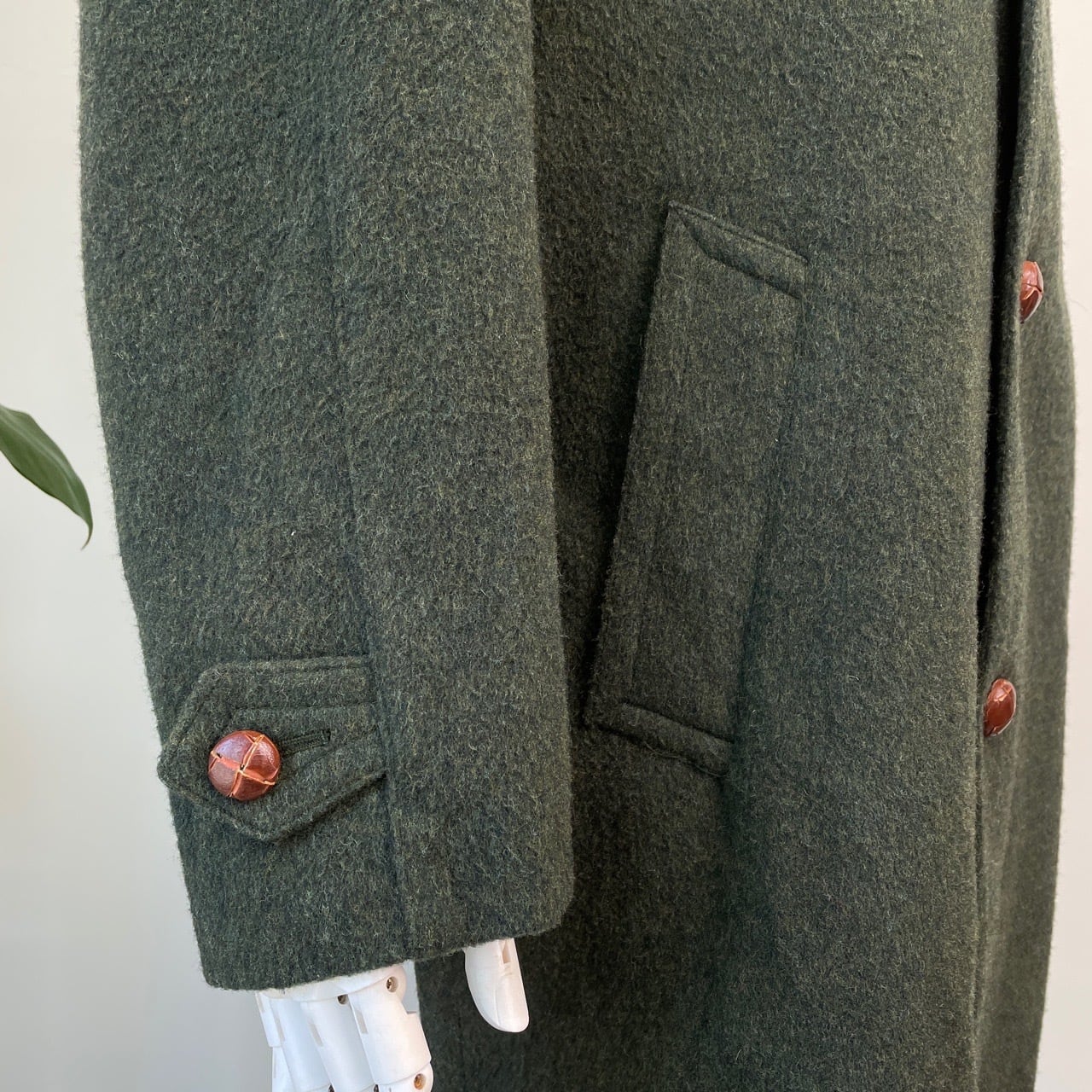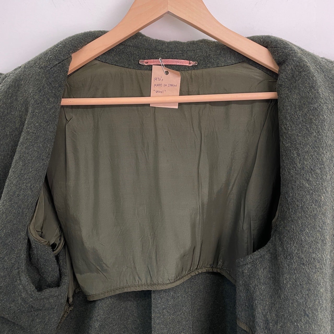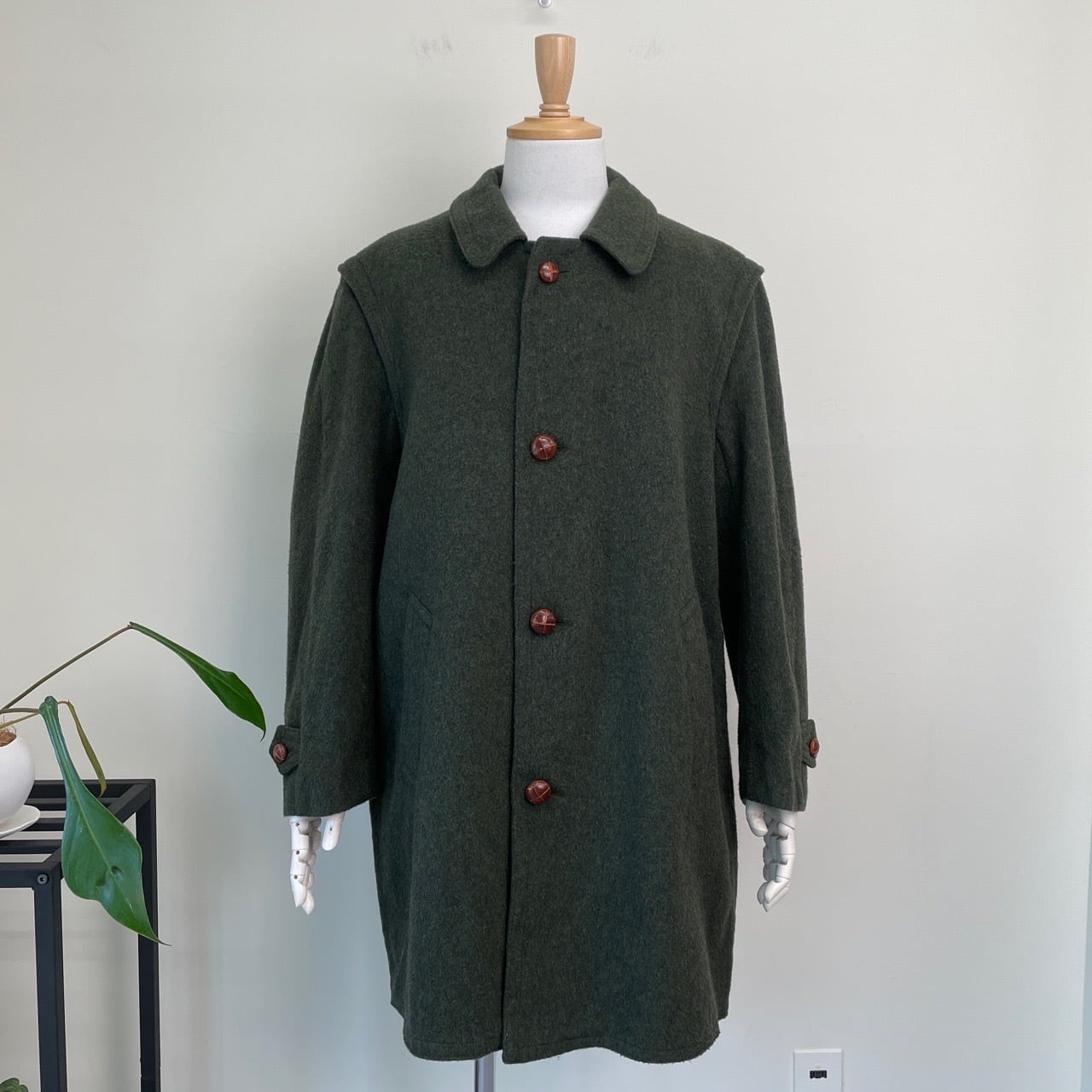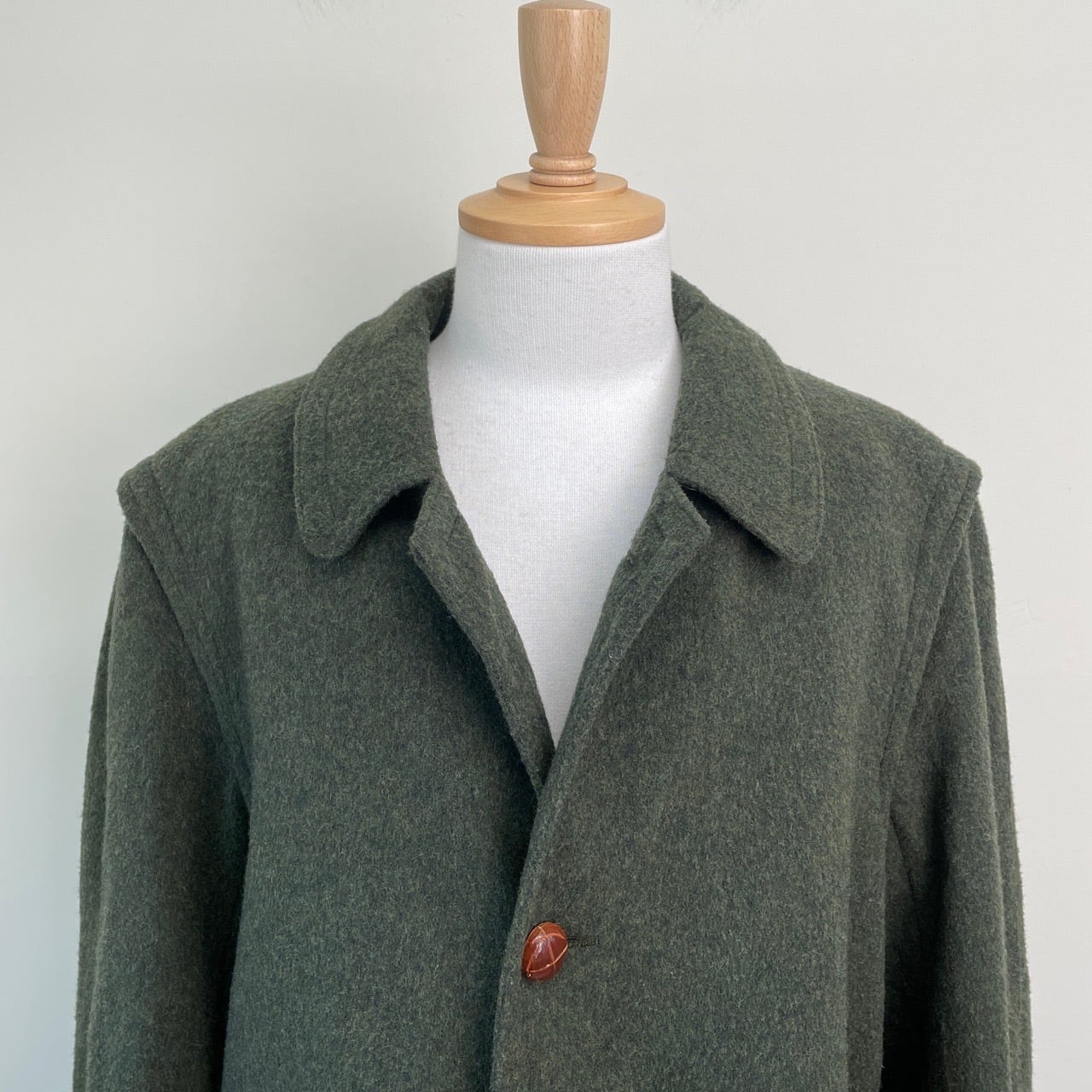 70s Palma スペイン製 ウールコート ヴィンテージ 古着 オリーブグリーン レザーくるみボタン 緑 ハーフコート シングルブレスト 70年代 ユーロ 50 25120802