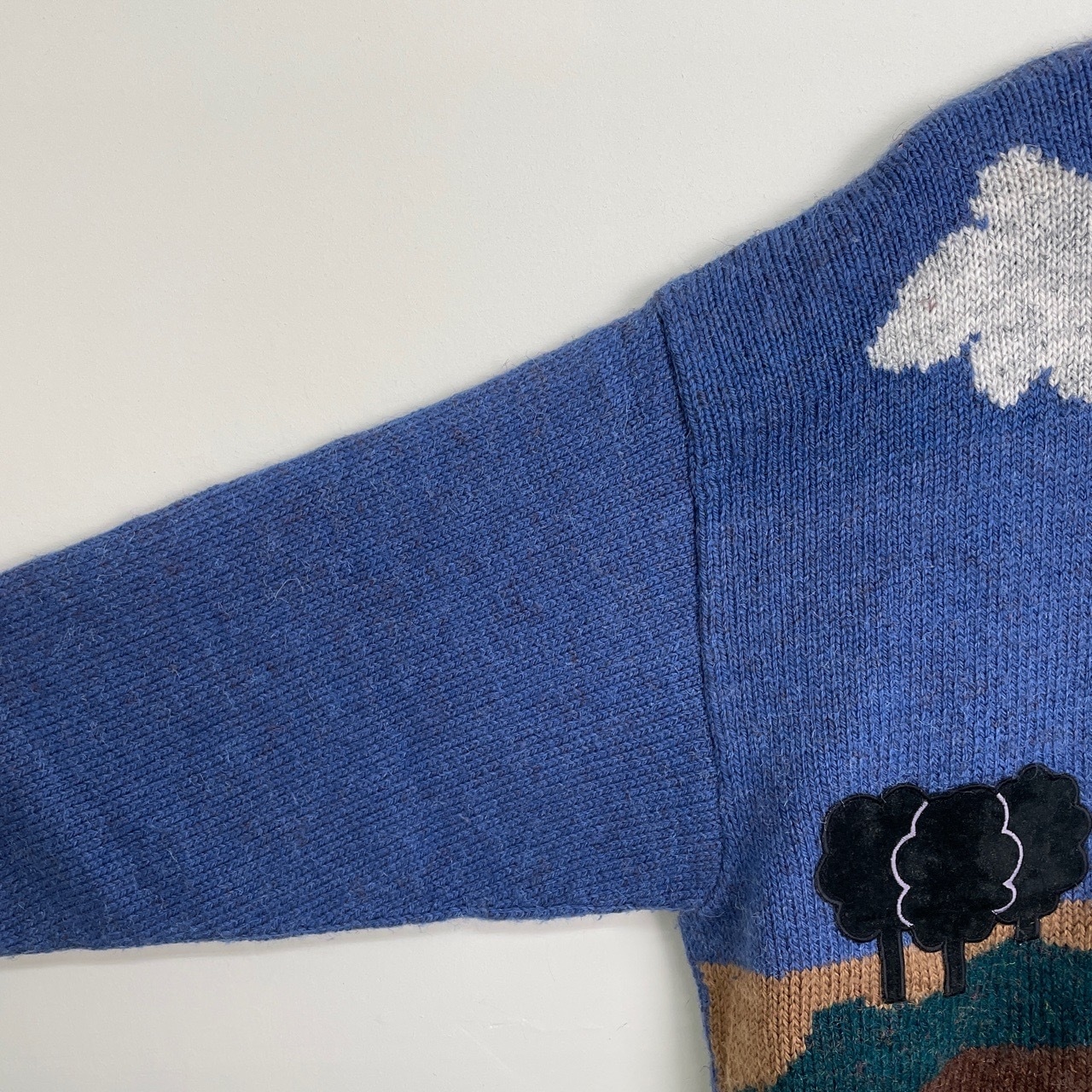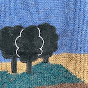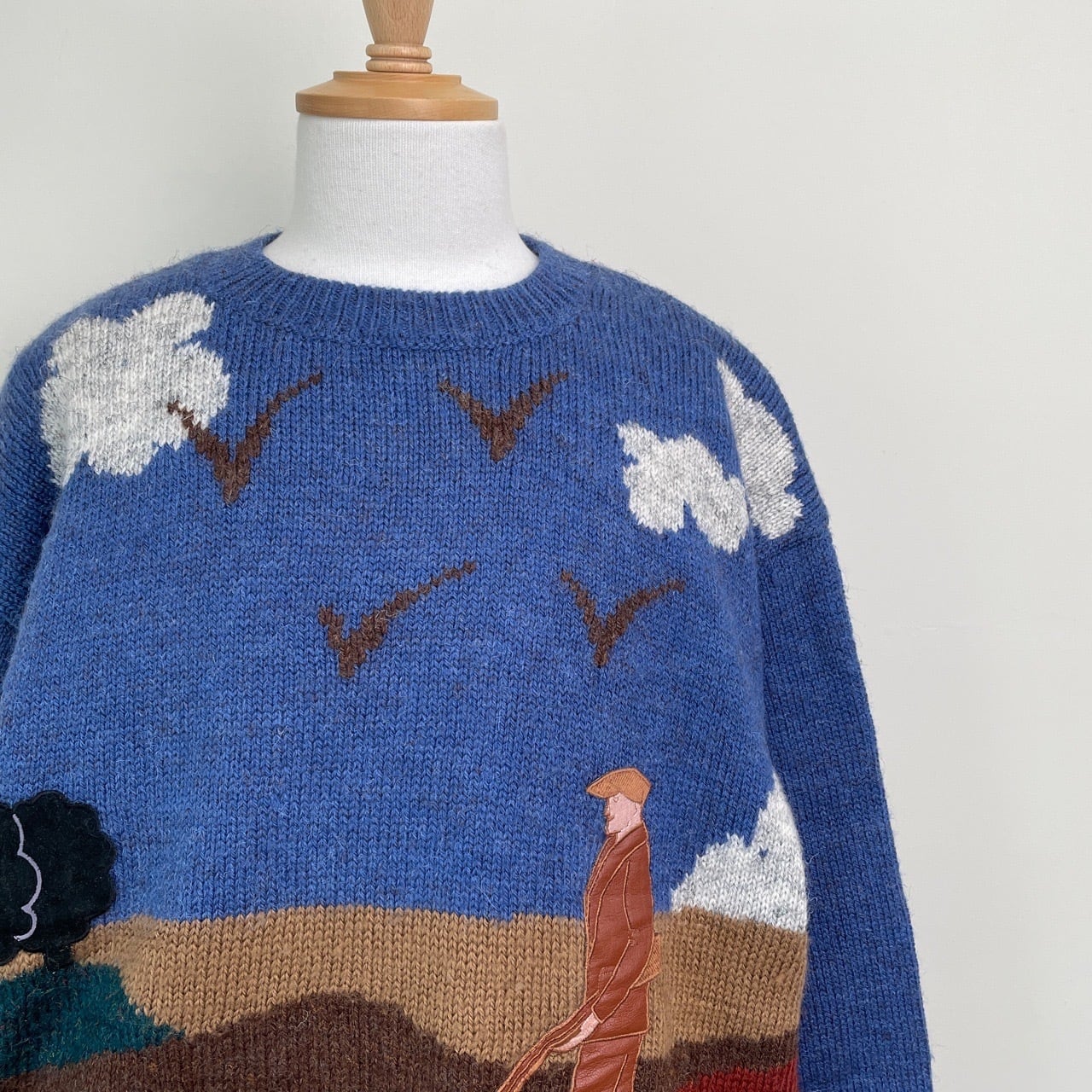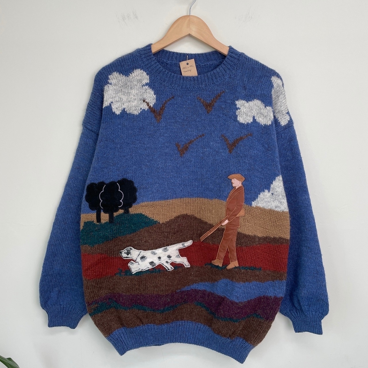 80s 90s 犬 ハンティング アート ニット セーター ヴィンテージ 古着 ウール アクリル 水色 ライトブルー 風景 アニマル 動物 80年代 90年代 ビンテージ 25120902