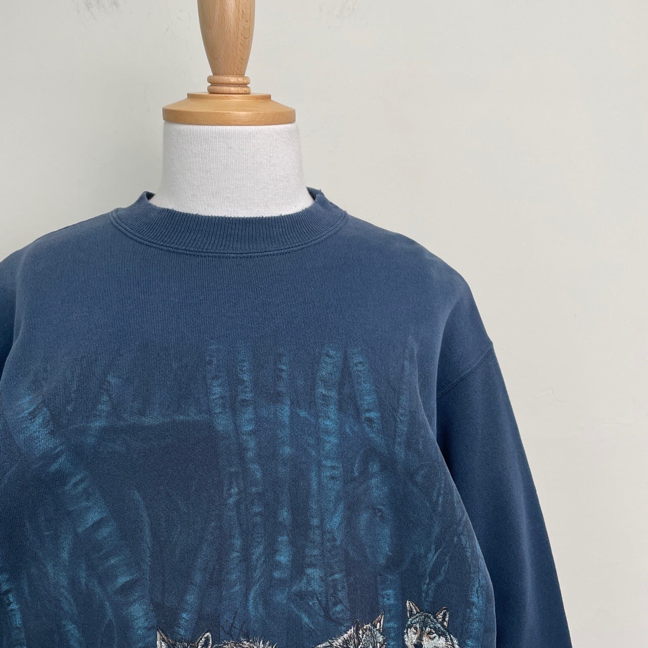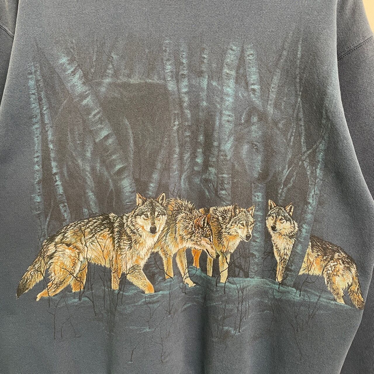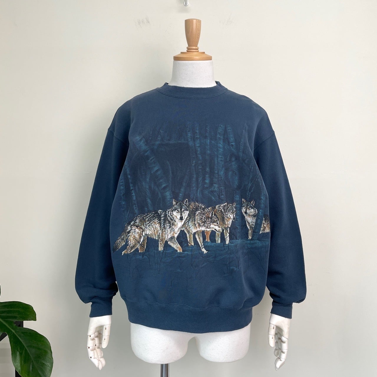 90s オオカミ アニマルスウェット ヴィンテージ 古着 狼 動物 アニマル スウェット アート 青 ブルー 90年代 ビンテージ L 26021110