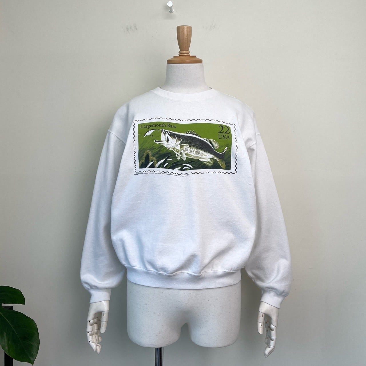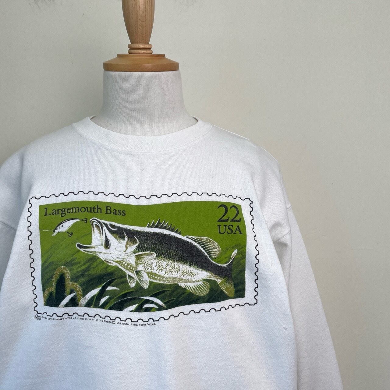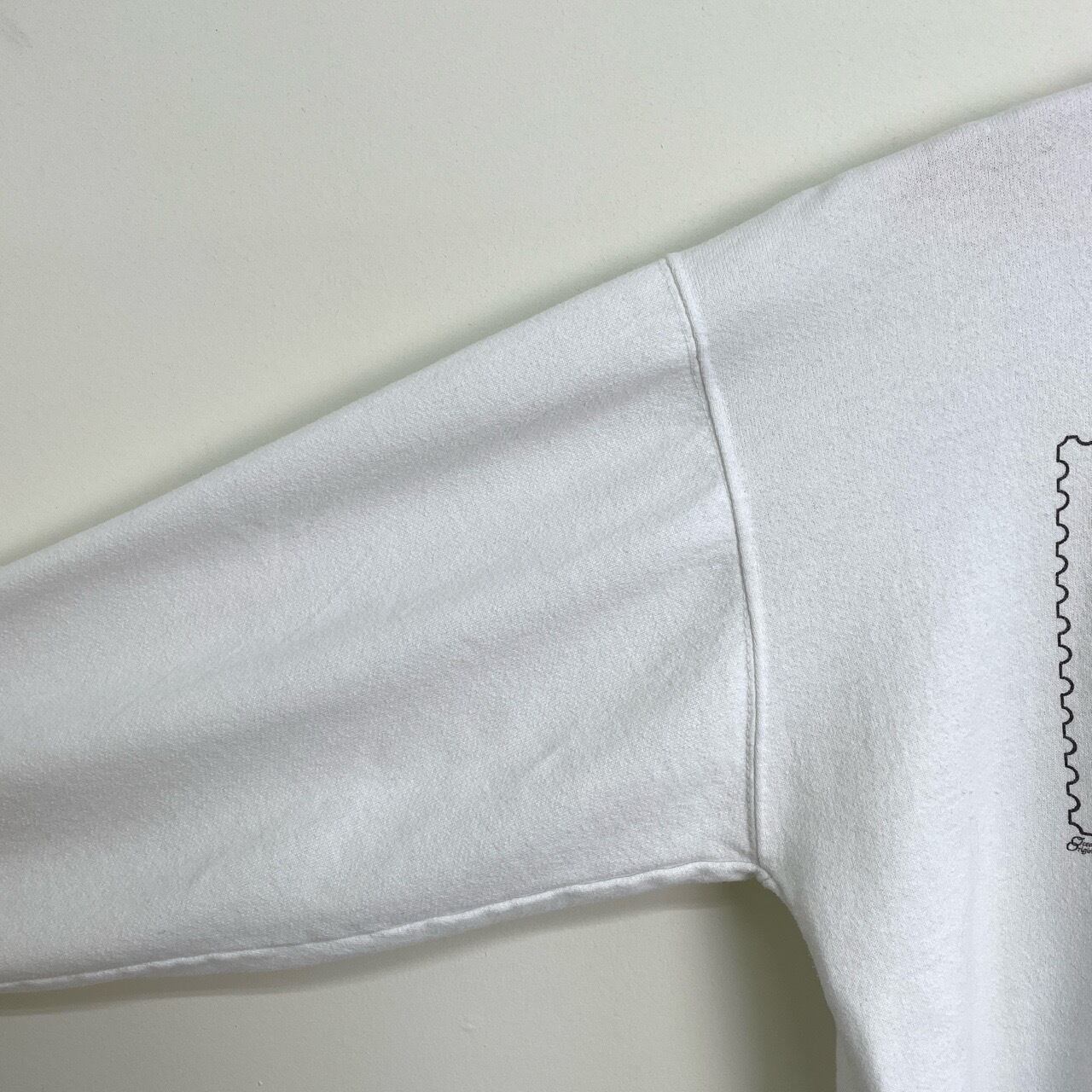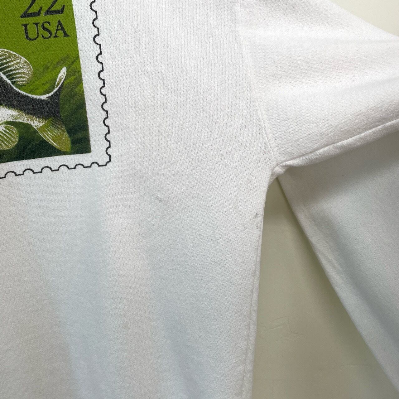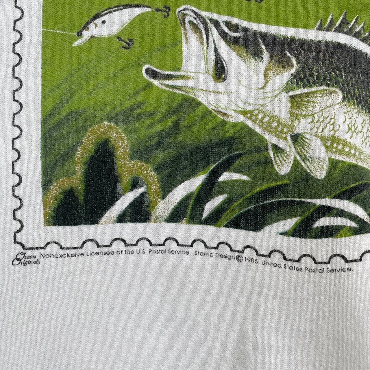 80s USA製 USPS バス フィッシング 切手 スウェット ヴィンテージ 古着 釣り 魚 ブラックバス 白 ホワイト アート 80年代 ビンテージ L 26021601