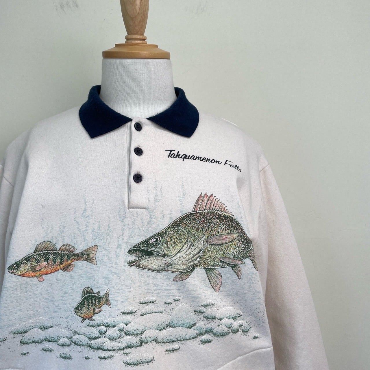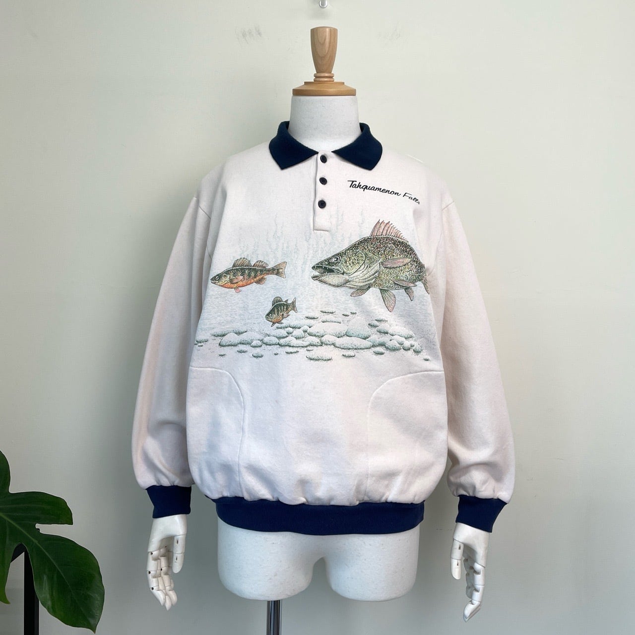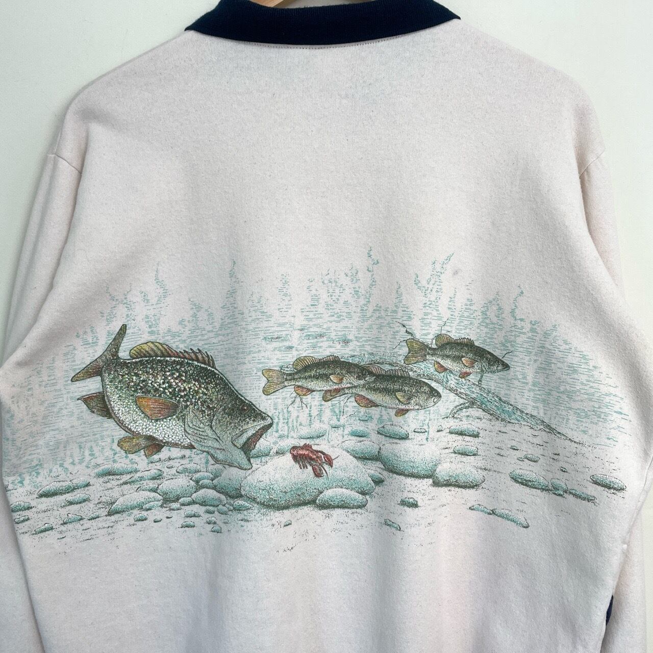 90s 魚 ポロカラー 襟付き スウェット ヴィンテージ 古着 白 ホワイト 動物 アニマルスウェット 90年代 ビンテージ L 26021605