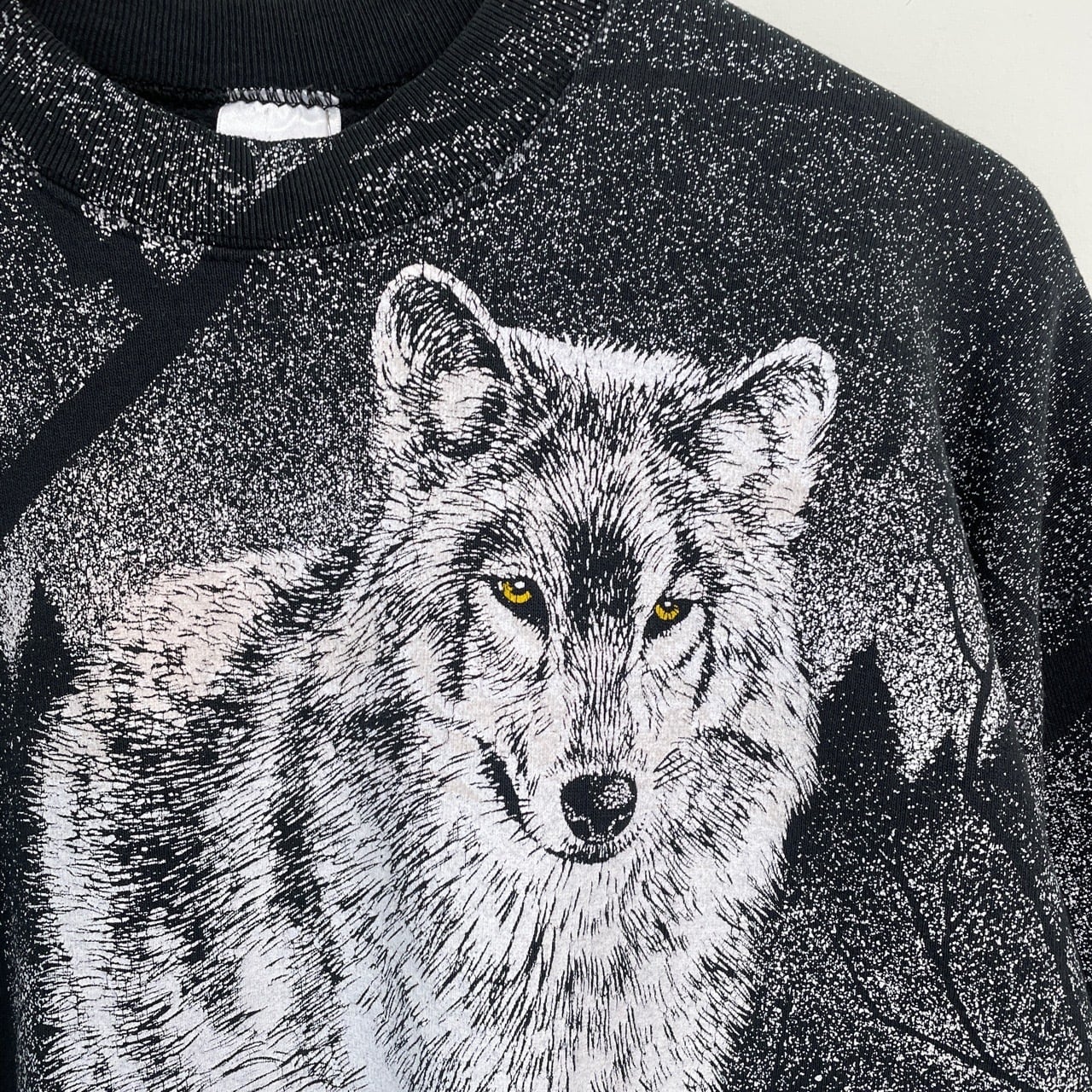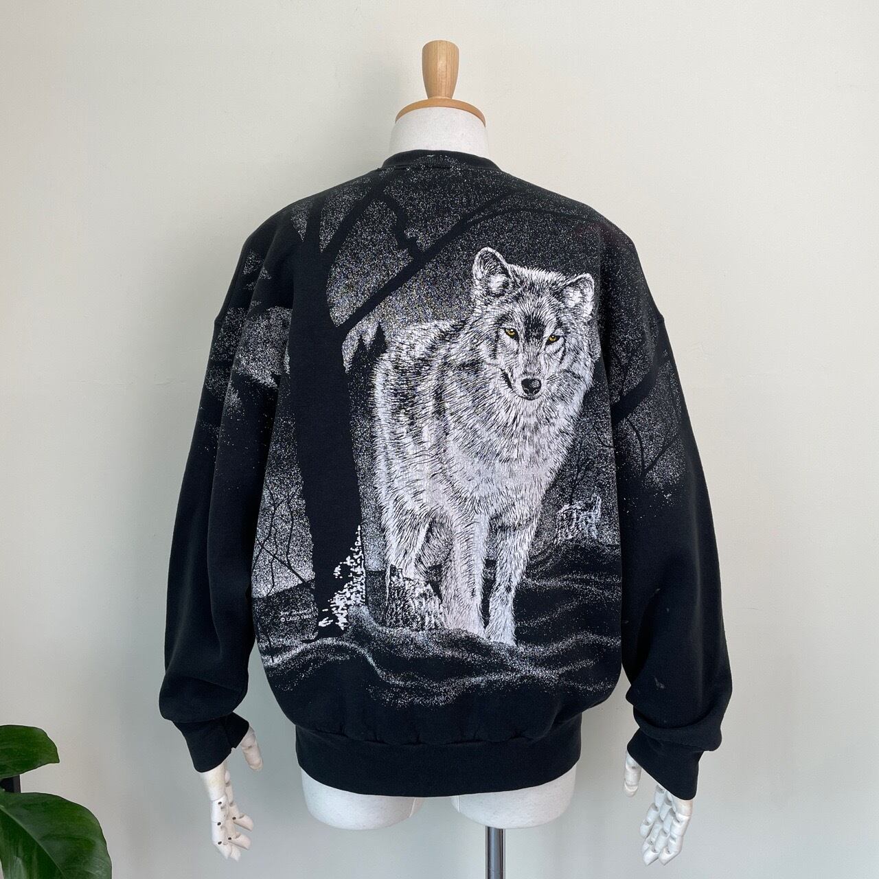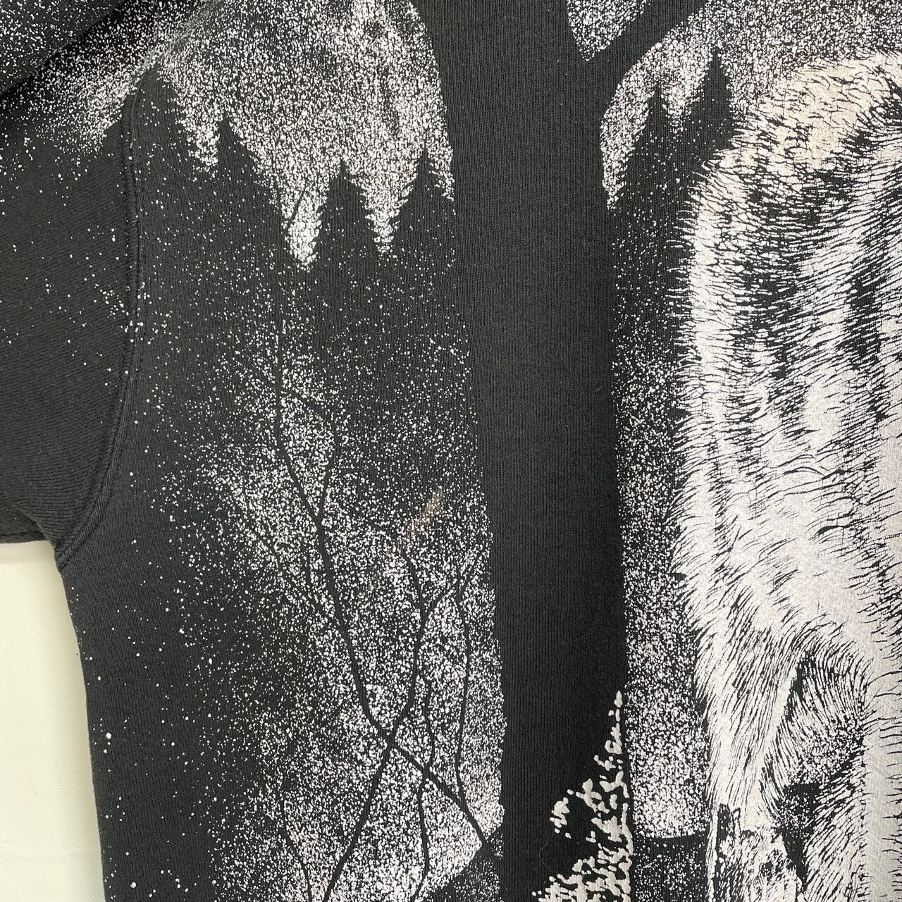 90s カナダ製 オオカミ アニマルスウェット 黒 ブラック ヴィンテージ 古着 狼 ウルフ 動物 アート オールオーバープリント アニマルスウェット 90年代 ビンテージ XL 26021636