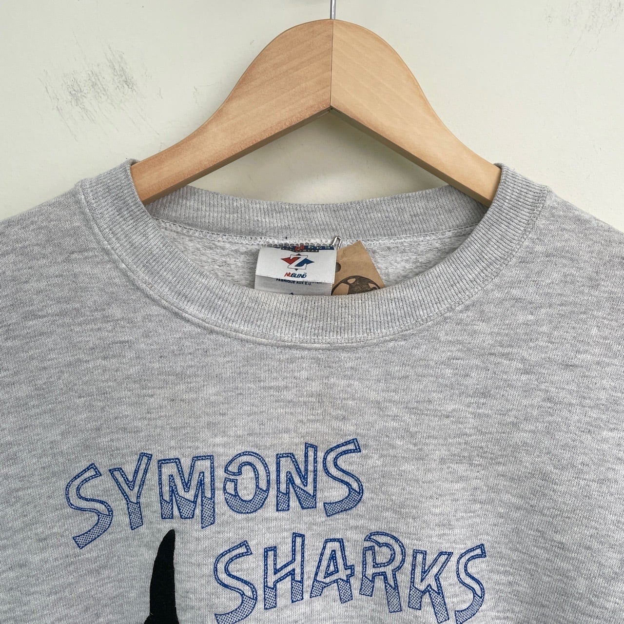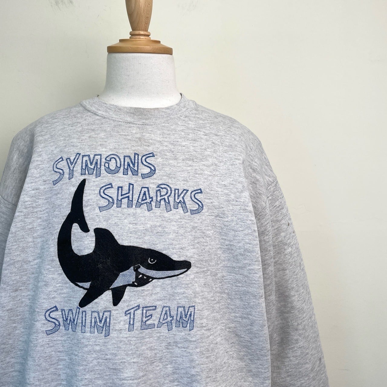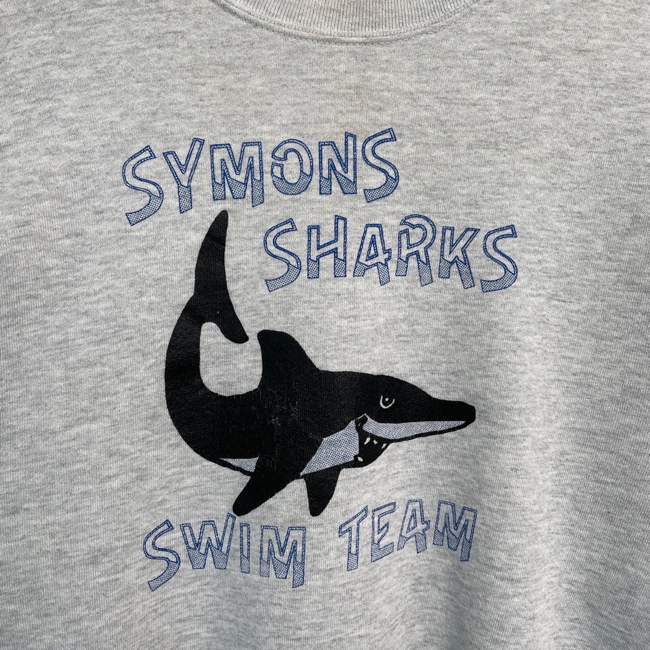 90s USA製 サメ 鮫 アニマルスウェット ヴィンテージ 古着 グレー 動物 魚 アニマル スウェット 水泳 スイミング チームロゴ 90年代 ビンテージ L 26022108