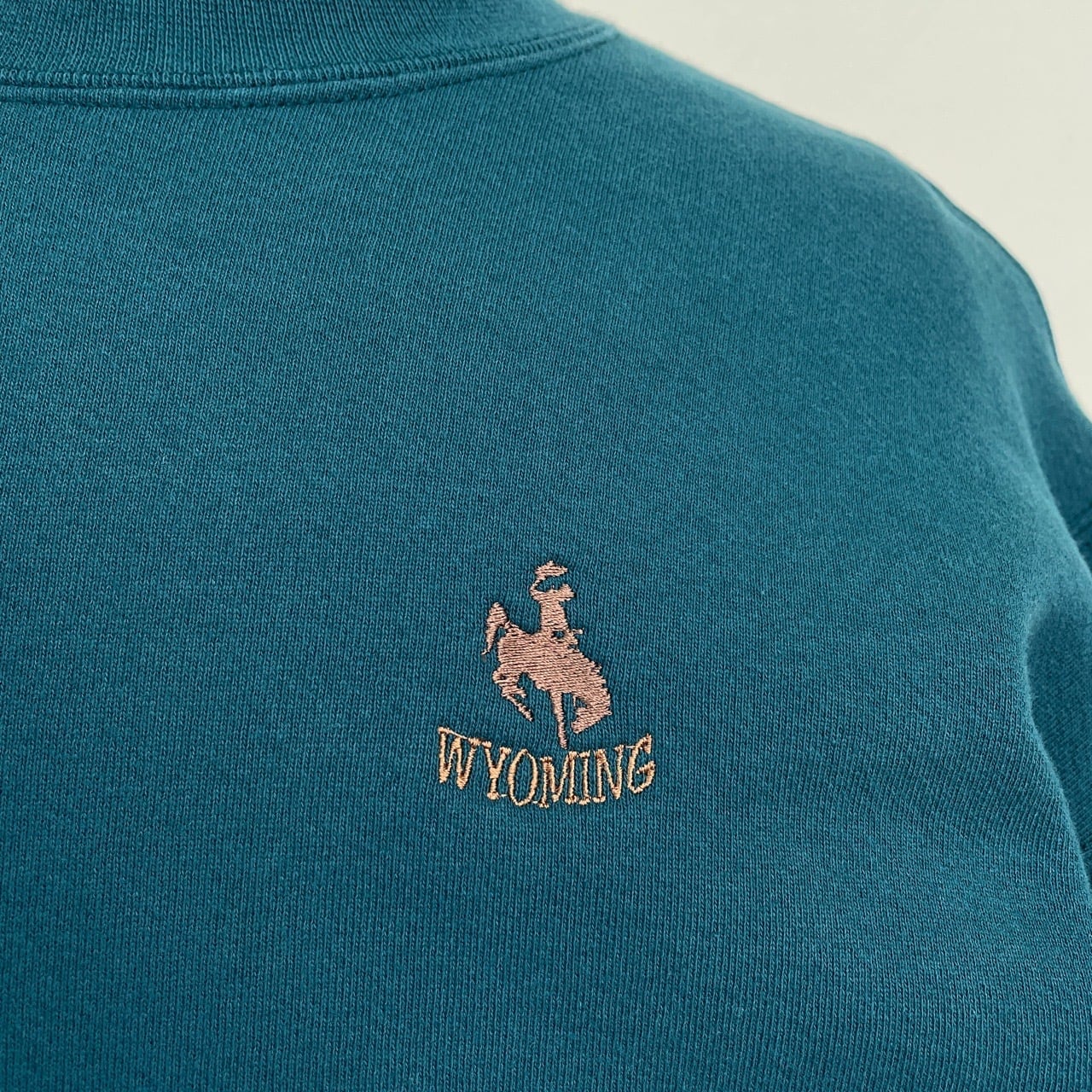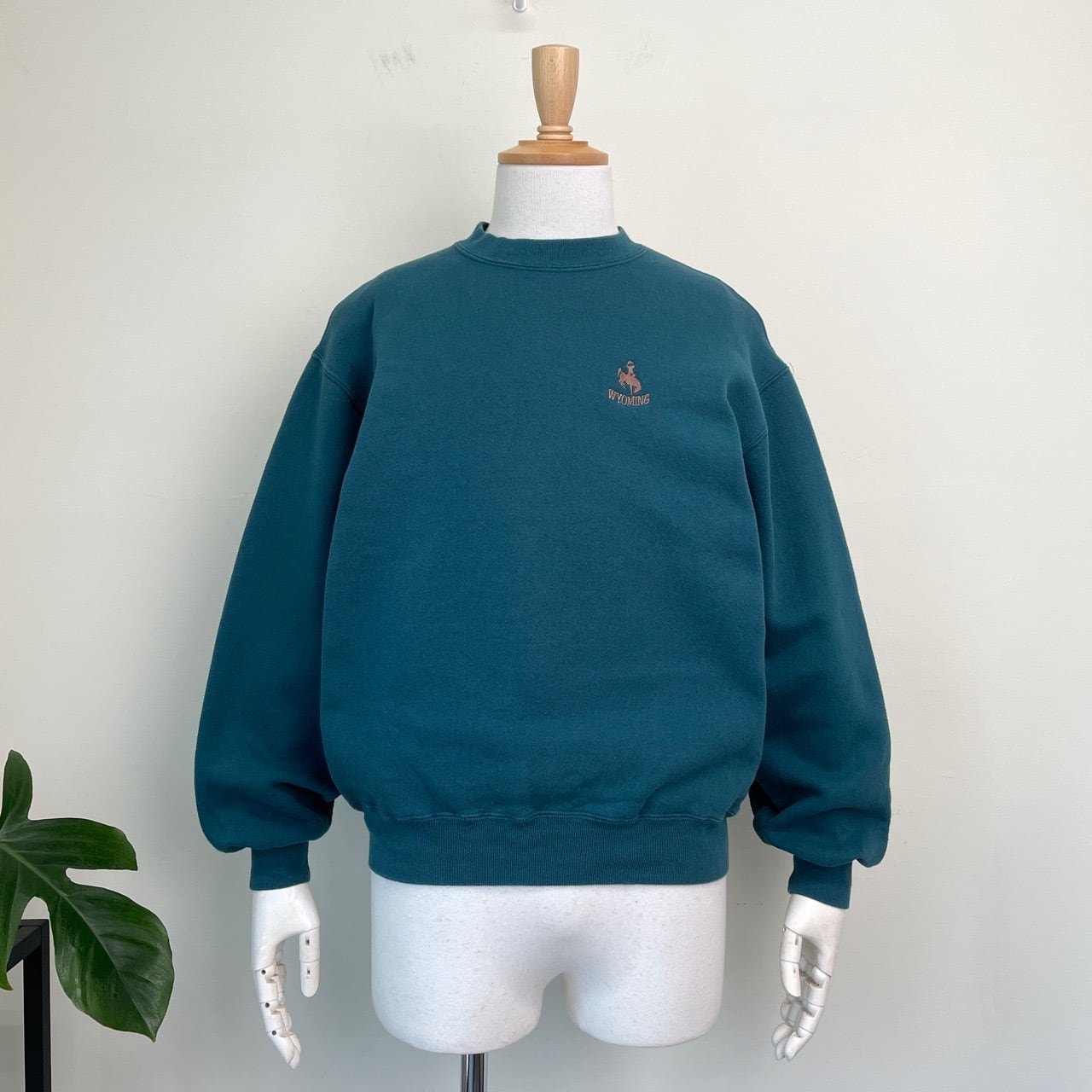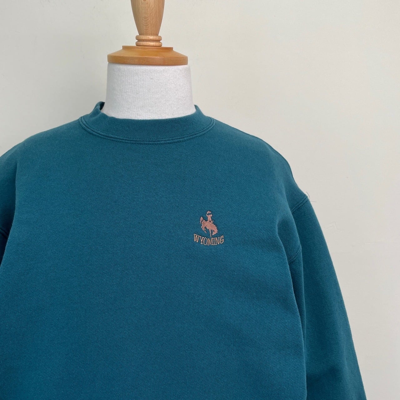 90s USA製 ワイオミング大学 カレッジロゴ ワンポイント刺繍 スウェット ヴィンテージ 古着 WYOMING カレッジスウェット 青緑 90年代 ビンテージ 26022110