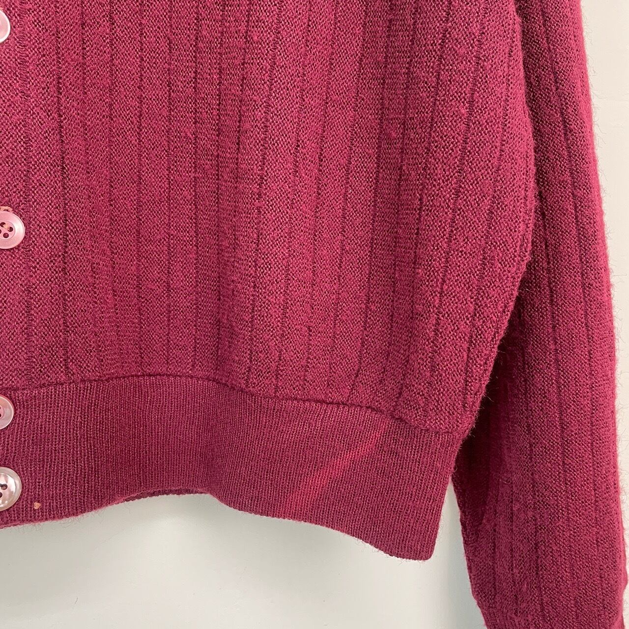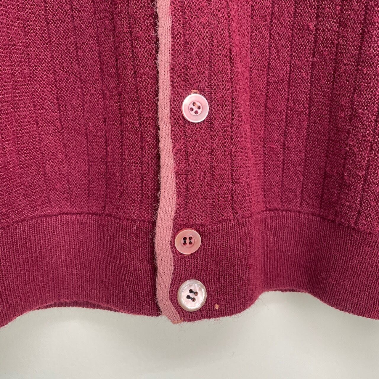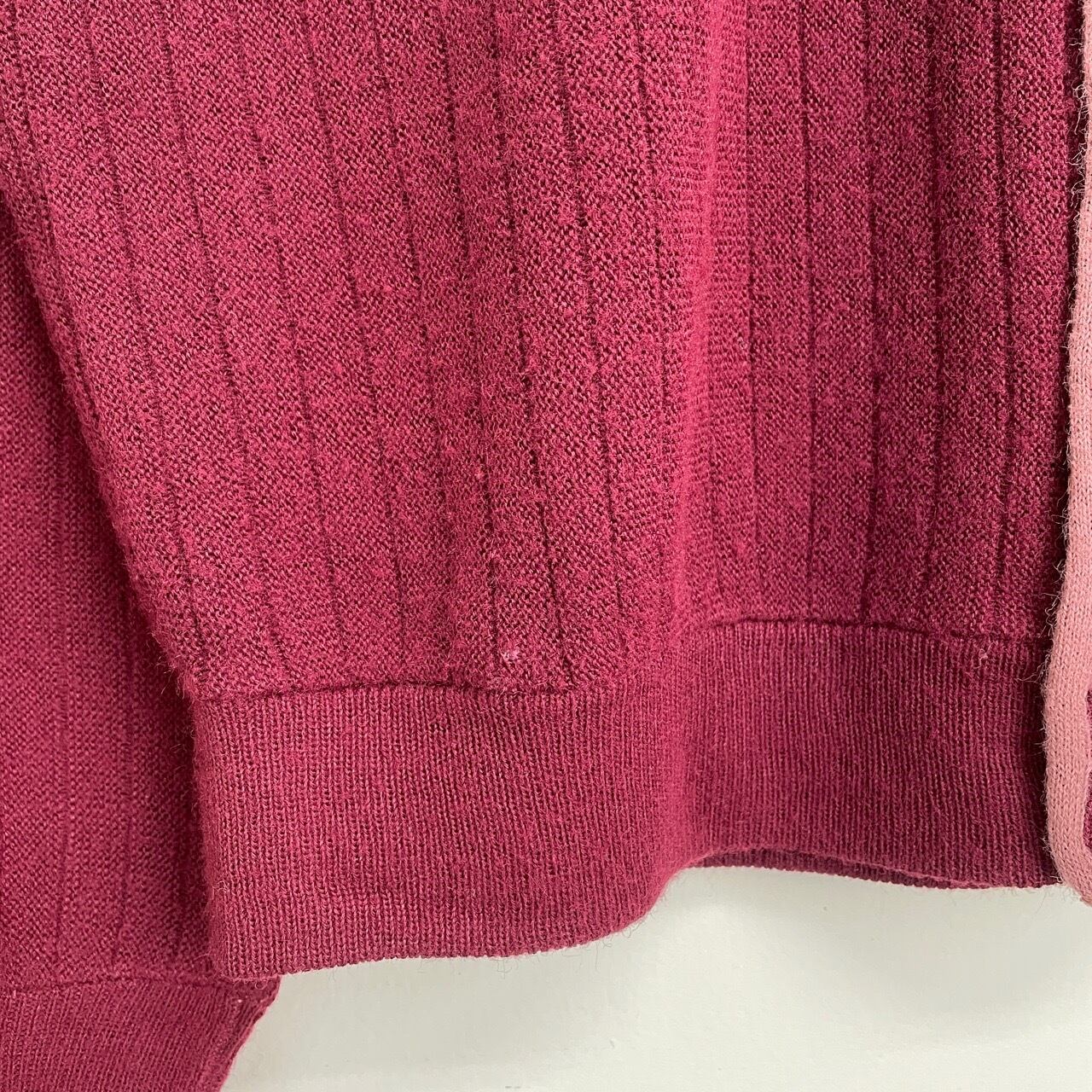 70s リブ編み ツートン アクリルカーディガン ヴィンテージ 古着 ニット 小豆色 バーガンディ マルーン ボルドー ワインレッド えんじ 70年代 ビンテージ 26030103