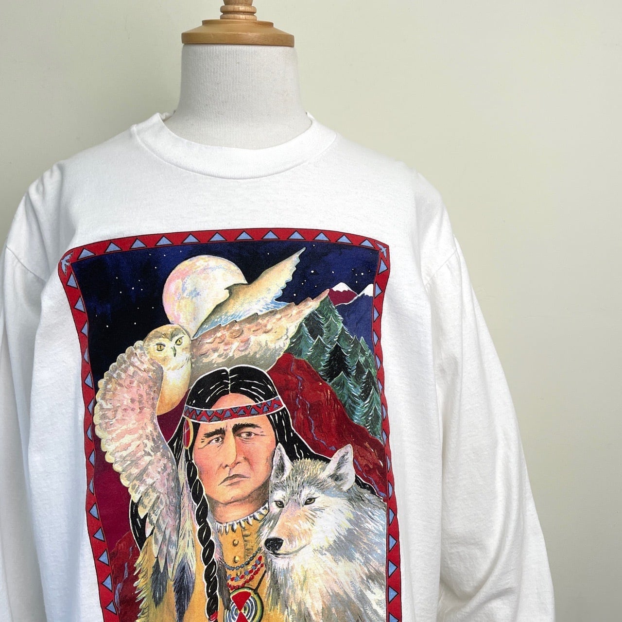 90s USA製 Human-i-Tees アート ロンT 長袖Tシャツ インディアン ネイティブアメリカン アニマル 動物 フクロウ オオカミ 狼 ウルフ ヴィンテージ 古着 90年代 ビンテージ 白 ホワイト L 26040305
