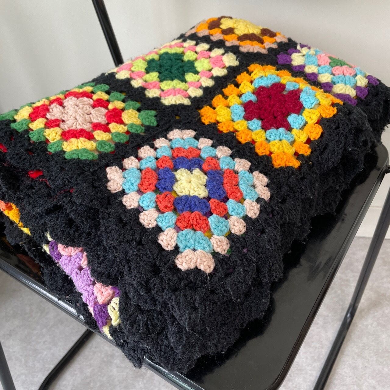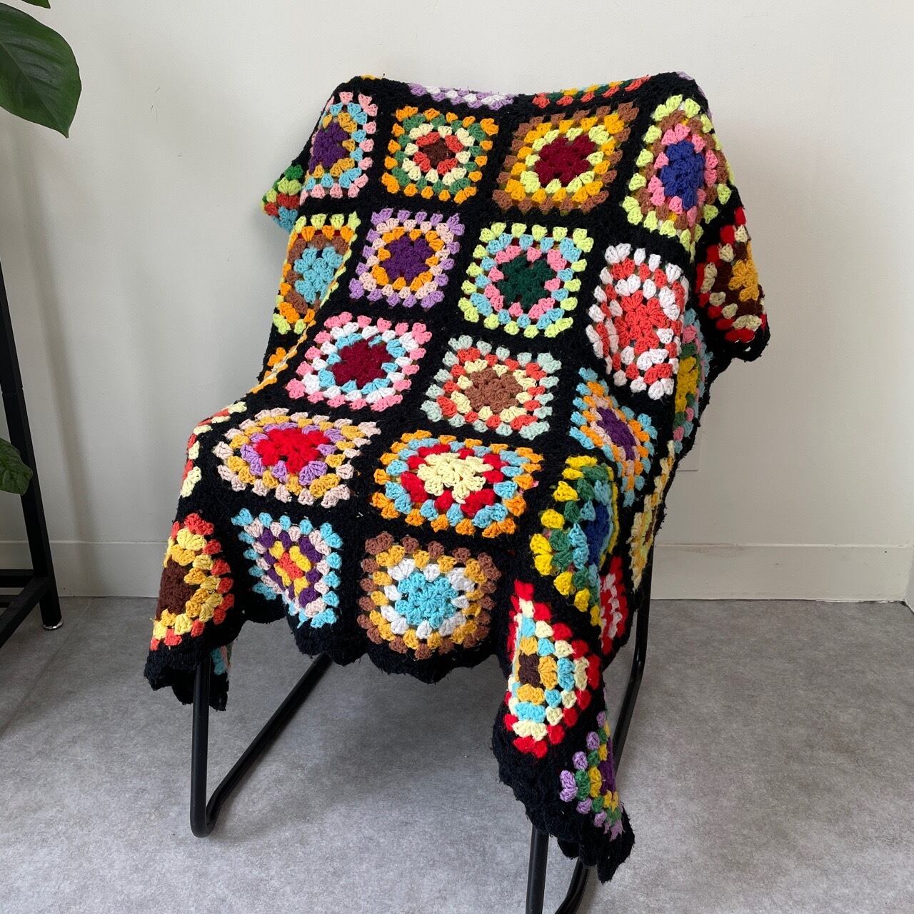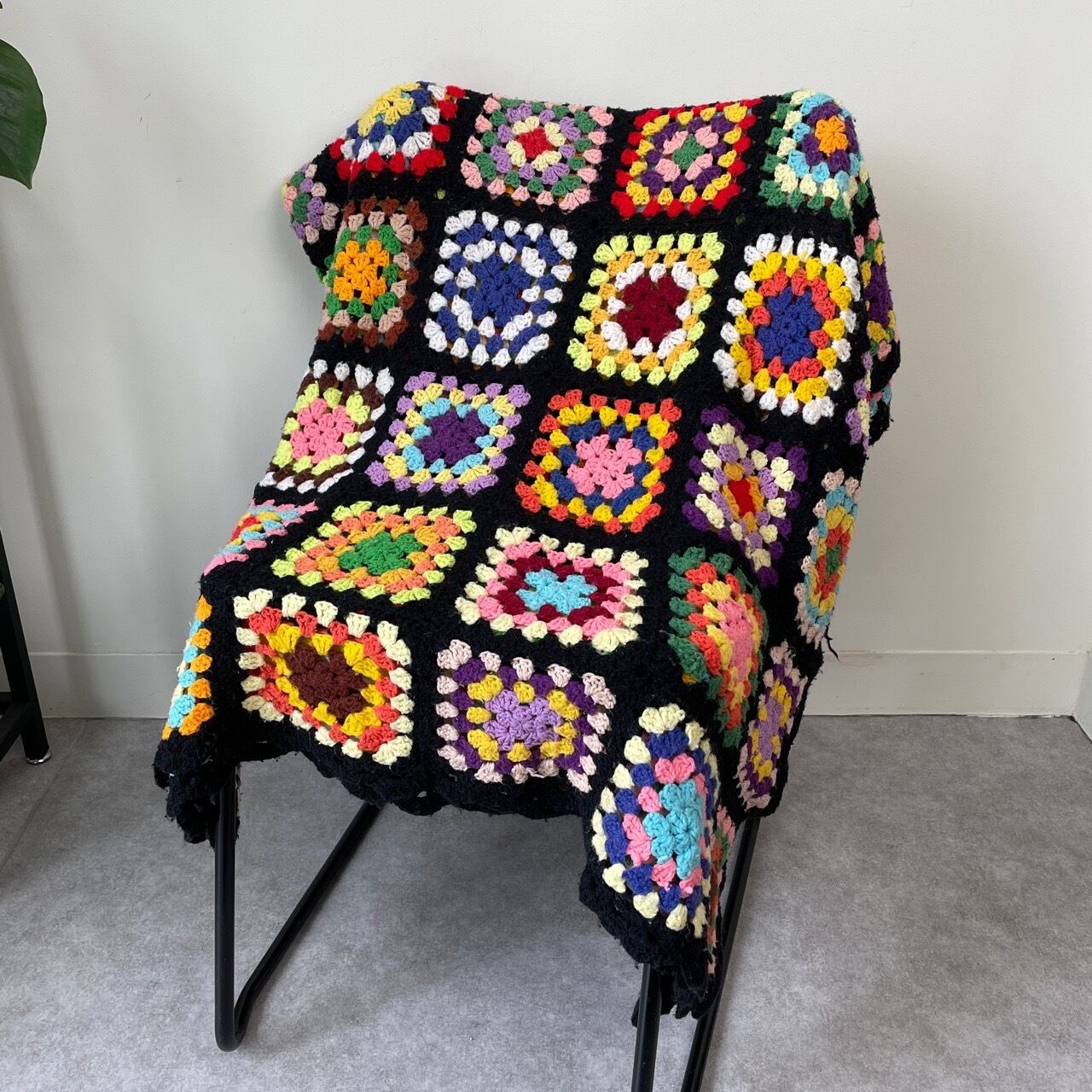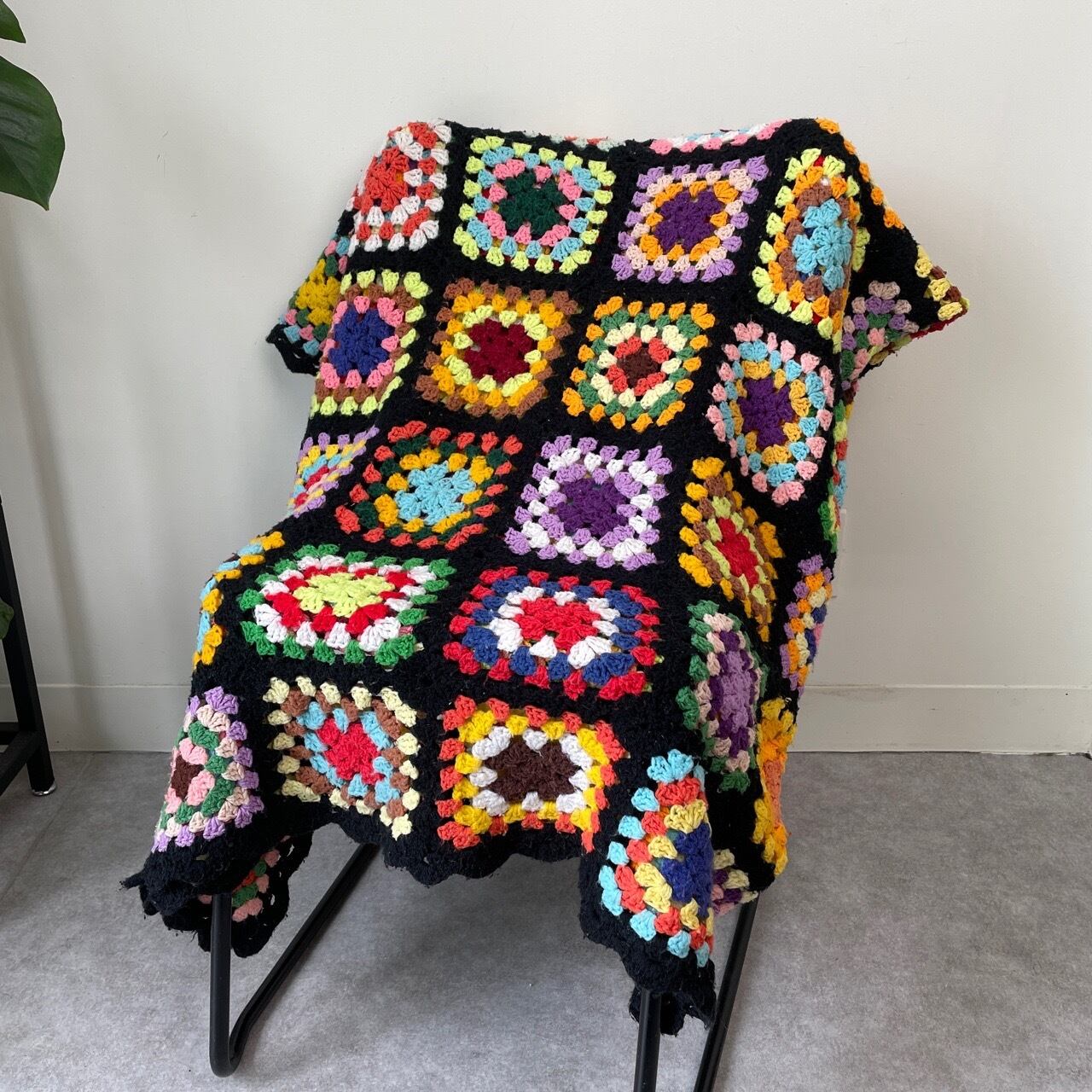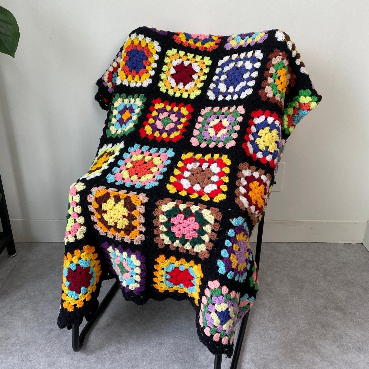USヴィンテージ グラニースクエア ブランケット カラフル レトロ 花柄 ラグ インテリア アメリカ ビンテージ ハンドメイド マルチカバー かぎ針編み ニット 26041011