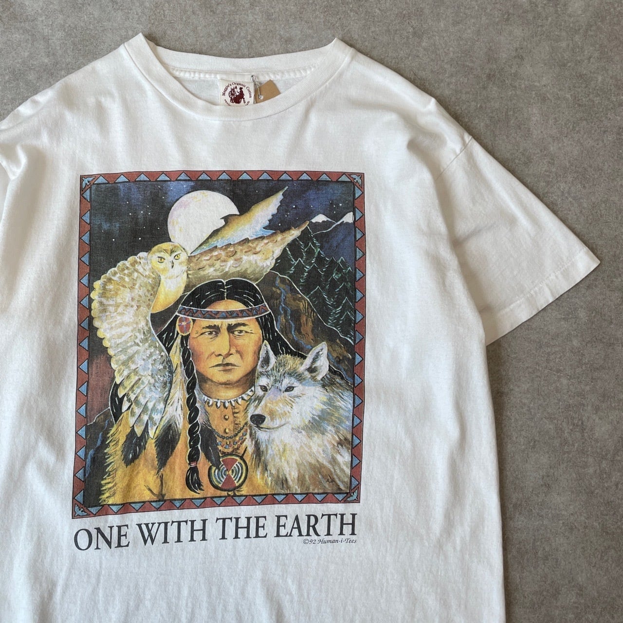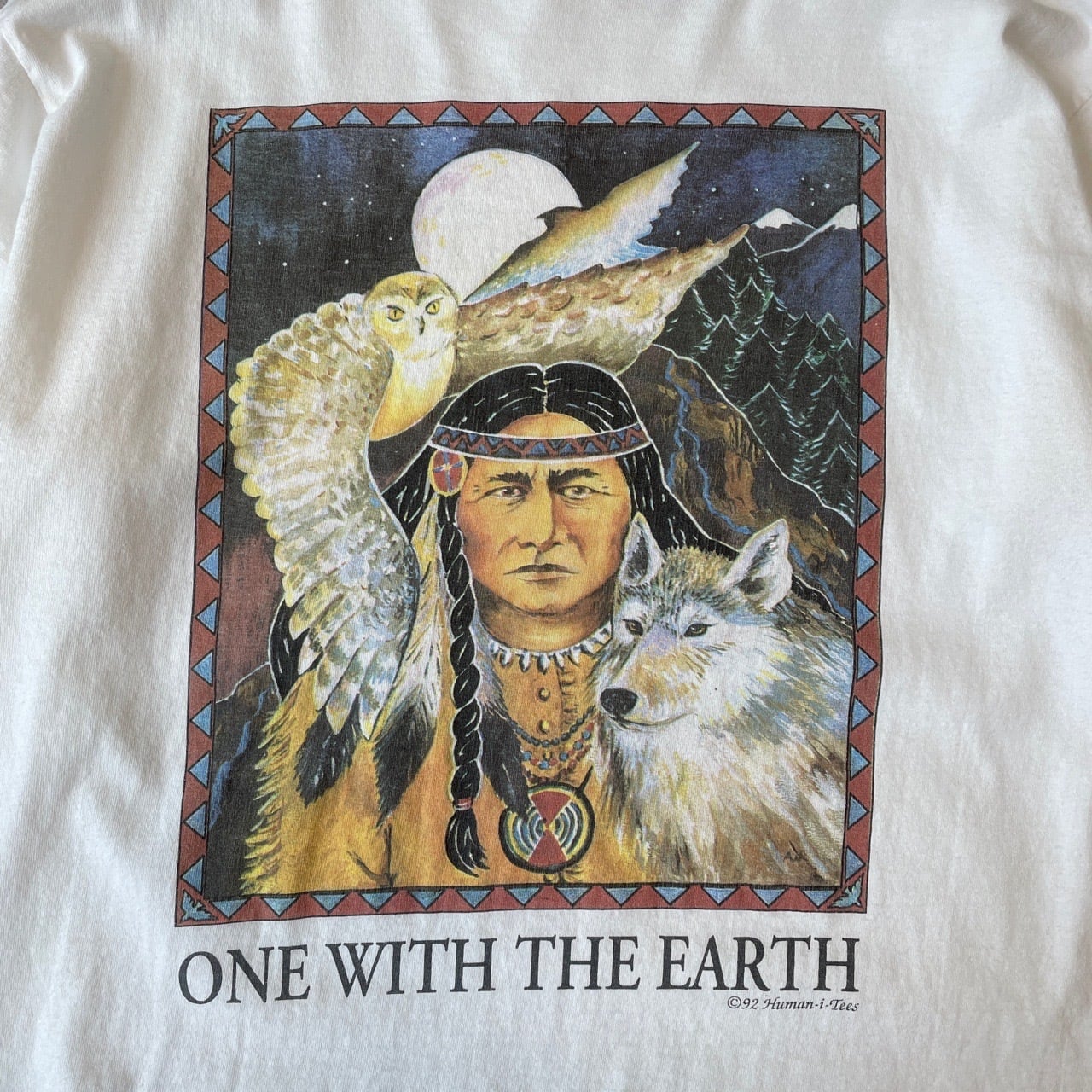 90s USA製 Human-i-Tees アートTシャツ ヴィンテージ シングルステッチ 古着 インディアン ネイティブアメリカン フクロウ オオカミ 狼 ウルフ 動物 アニマル 白 ホワイト 90年代 ビンテージ L 26042016