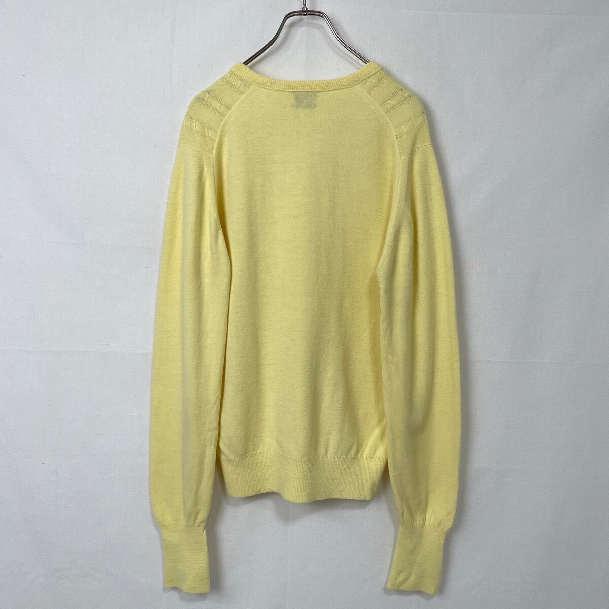 その他:レモンイエローの綺麗なカラー。アイコンのワニワッペン付き。よく出回っているものは無地ですが、こちらはケーブル編みのレアディテール。お探しの方はお早めに。