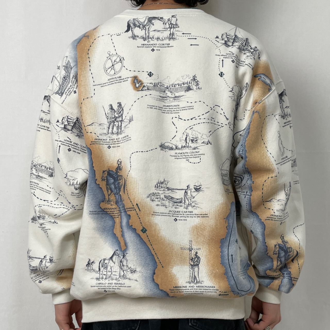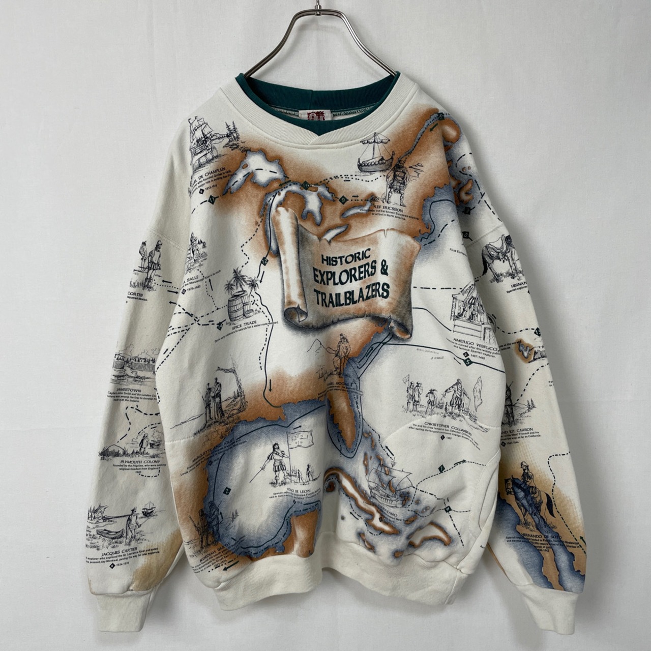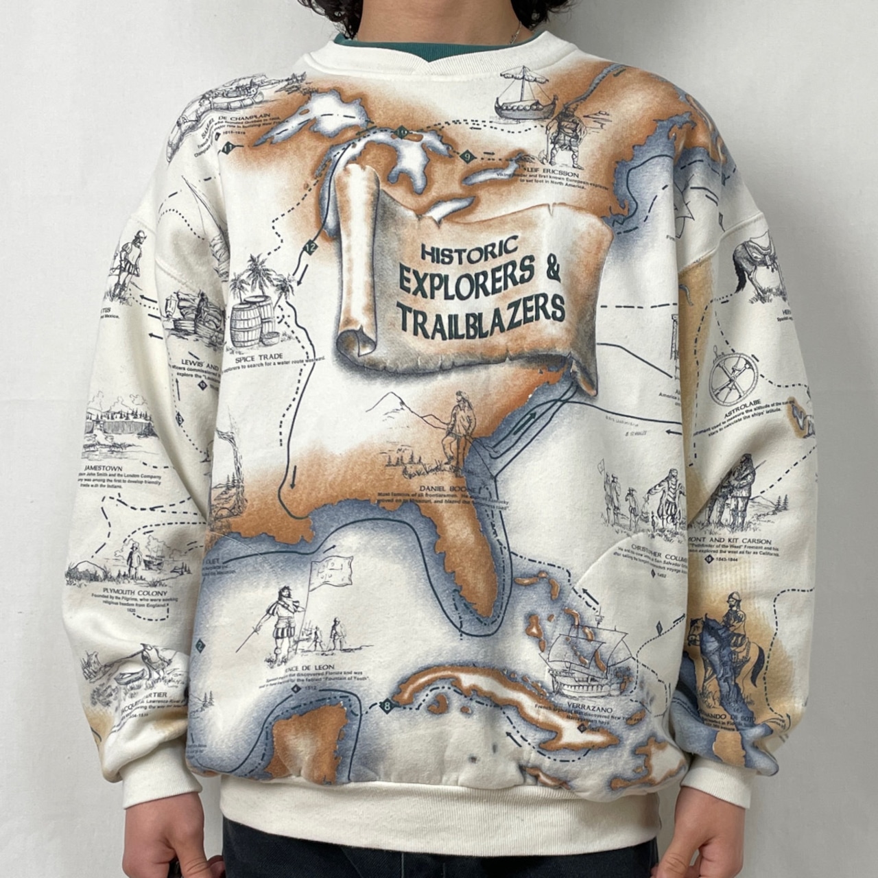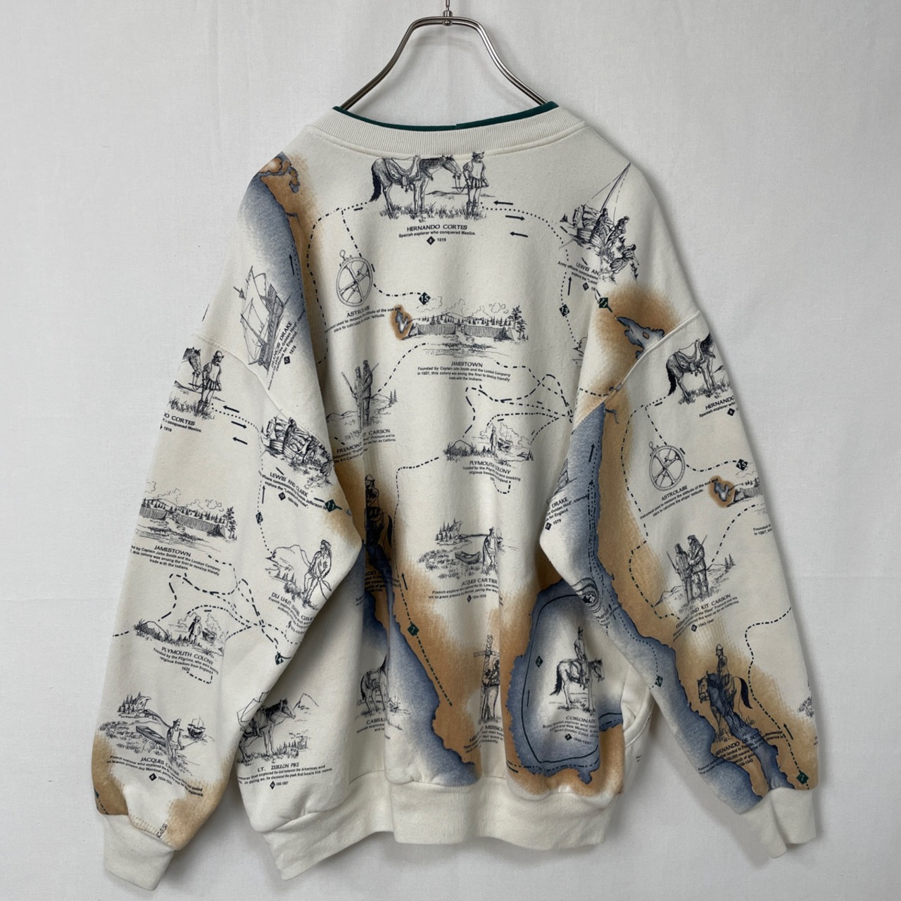 その他:裏起毛。ポケットx2。コロンブスなどの歴史的な探検家や開拓者と、地図が描かれた全面プリントのレアなデザイン。