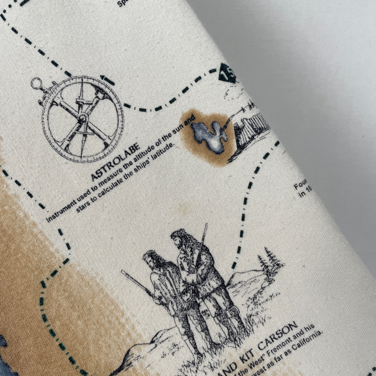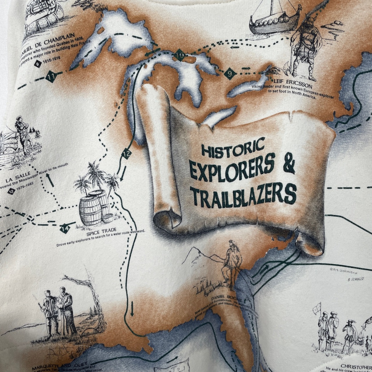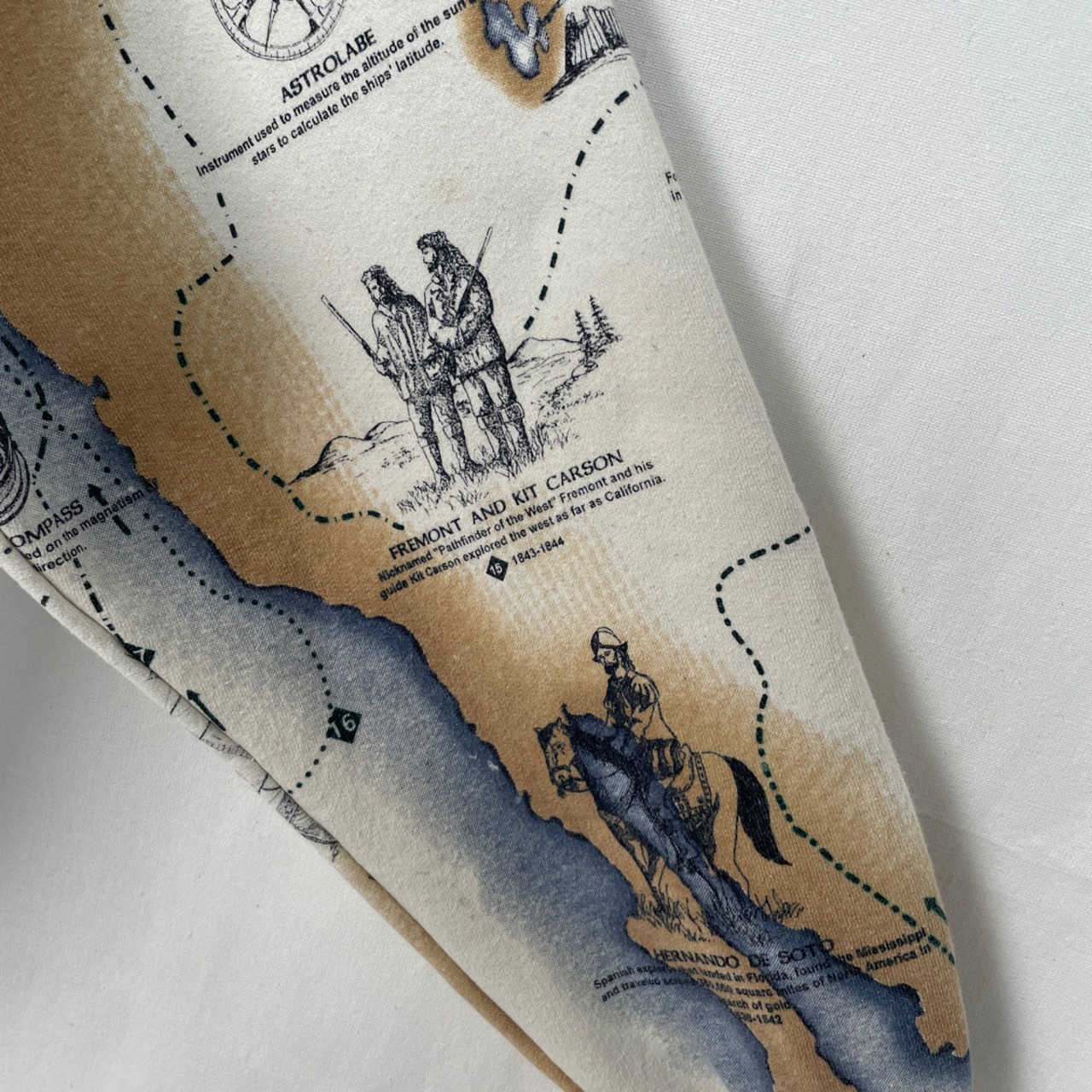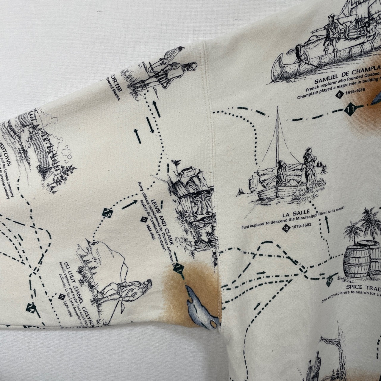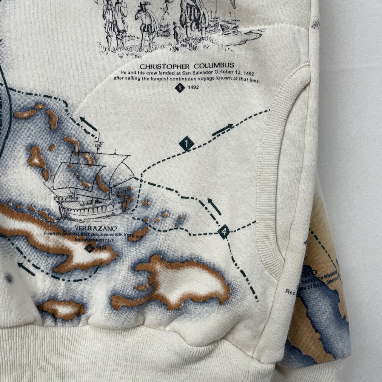その他:裏起毛。ポケットx2。コロンブスなどの歴史的な探検家や開拓者と、地図が描かれた全面プリントのレアなデザイン。