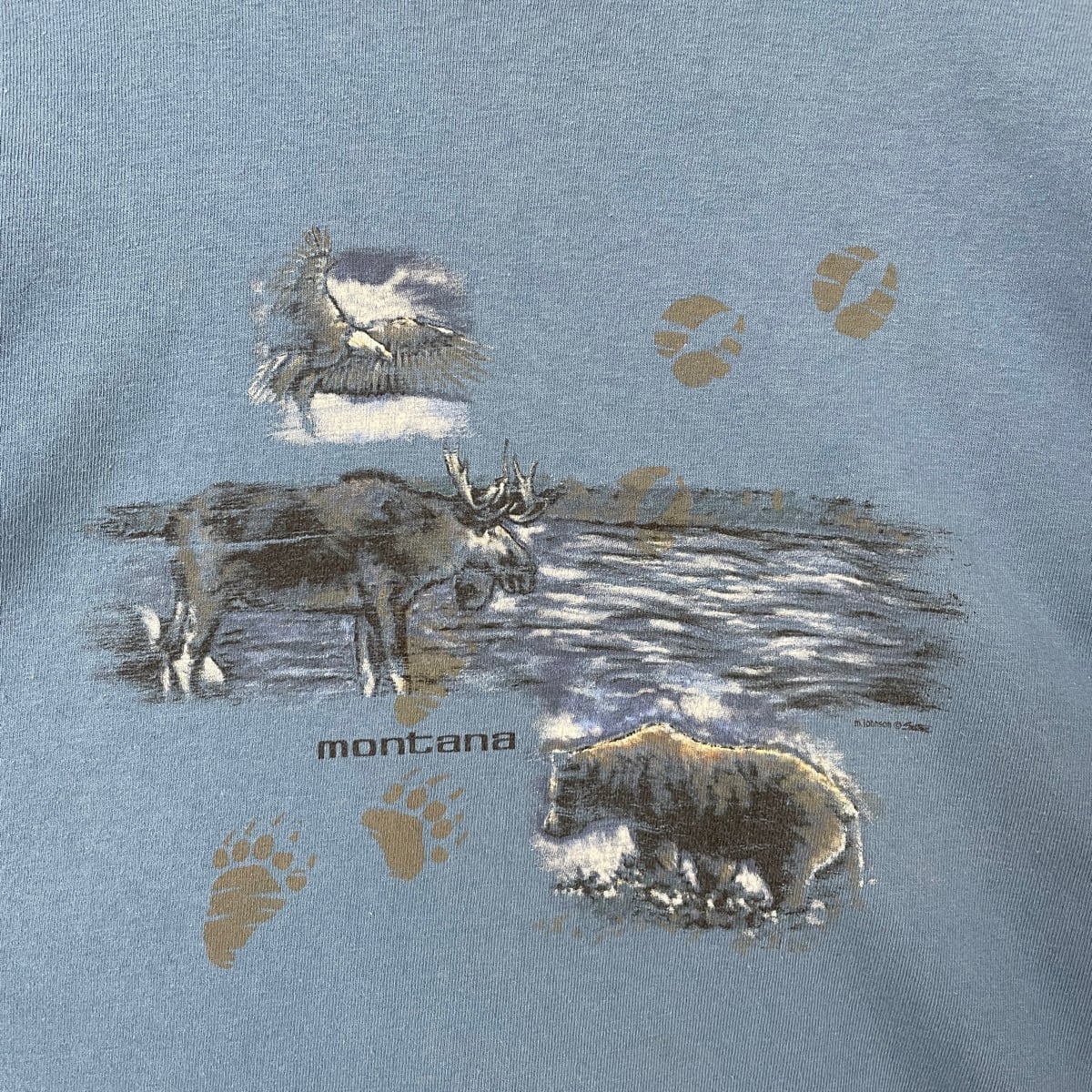 90s 00s montana アニマルTシャツ 古着 ヴィンテージ モンタナ州 アニマル 動物 水色 ライトブルー 90年代 Y2K 00年代 2000s 2000年代 ビンテージ コットン グラフィック プリント メンズ L 24082306